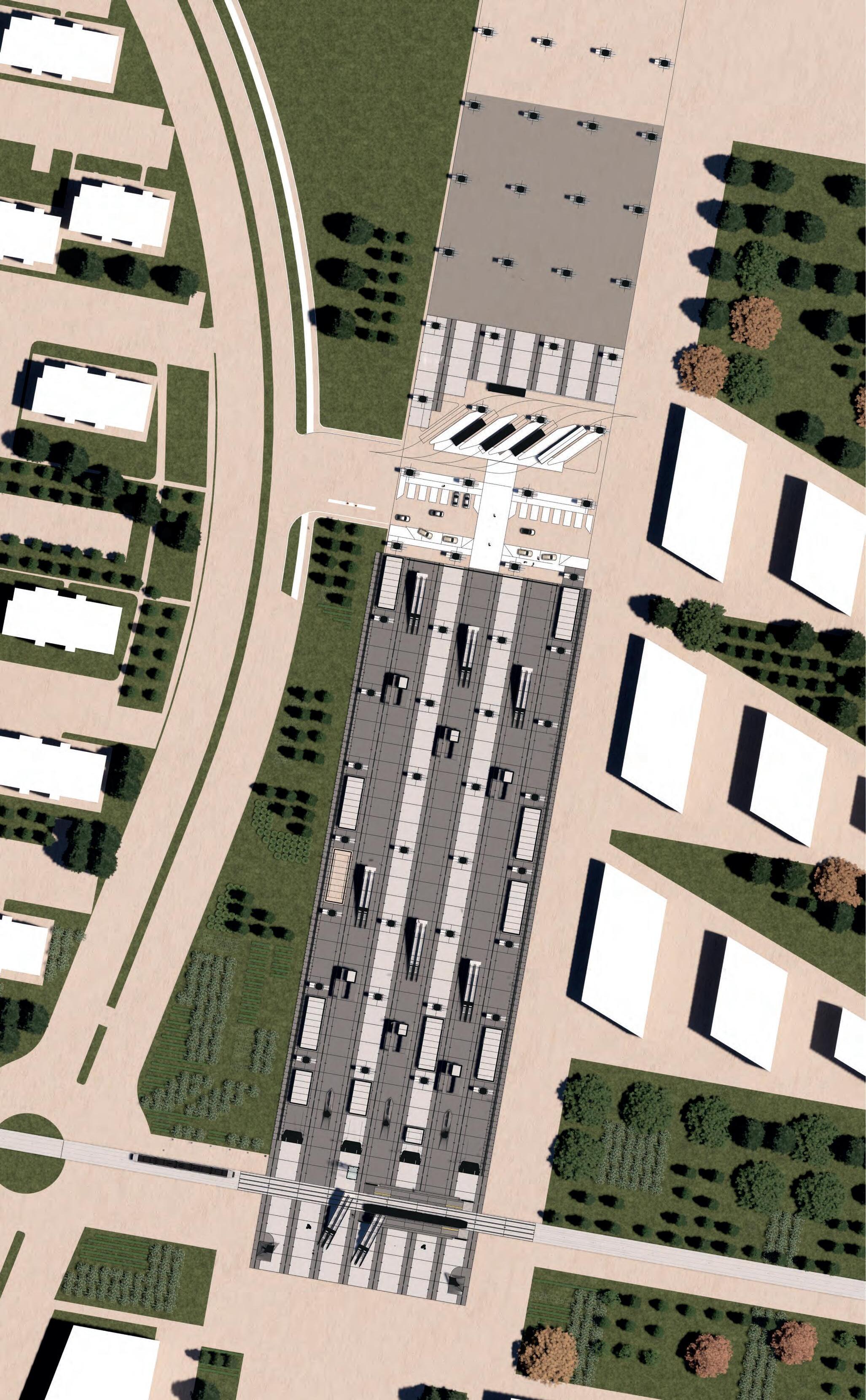 The created pedestrian boulevard will also link the business and residential districts with a large park south to the station.