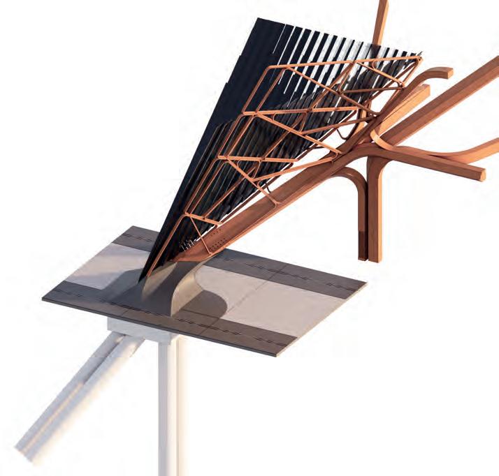 This method ensures that load paths are continuous, connections do not have to be CNC milled and different timber species can be seamlessly layered along the ribbons to locally increase strength.