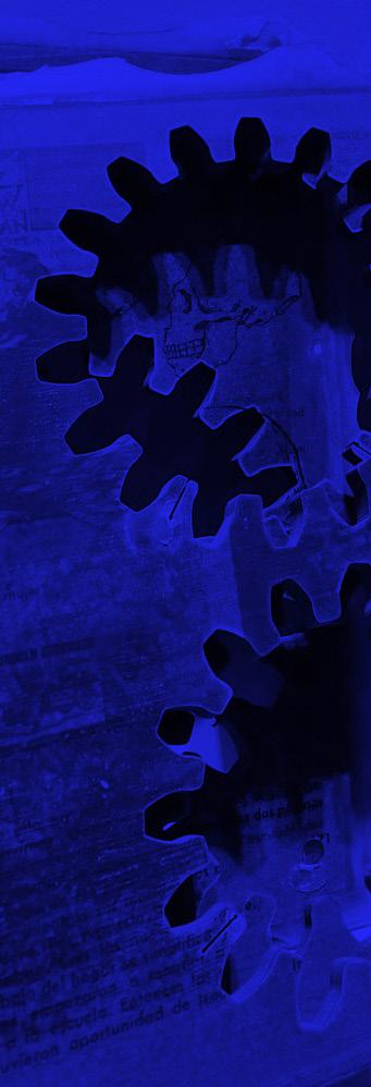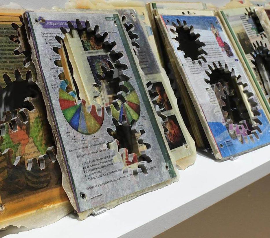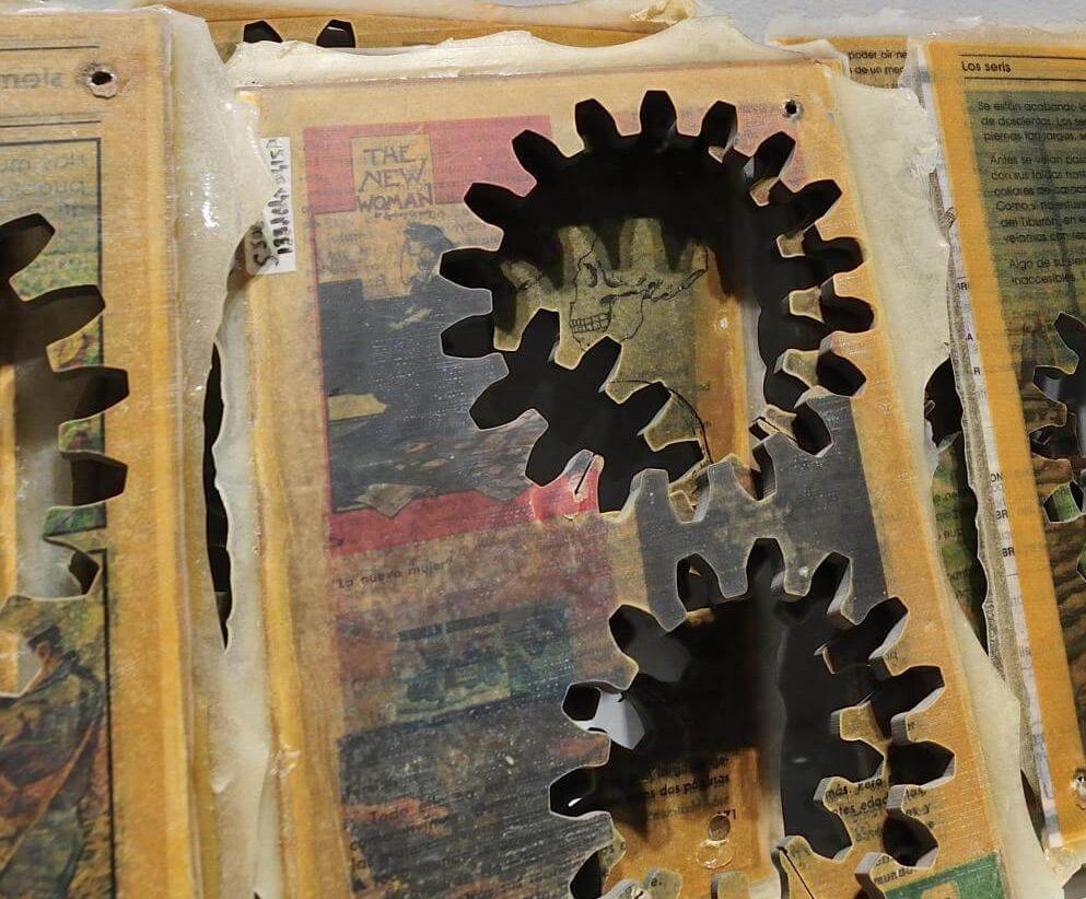 En cuanto a los engranes, cada uno está hecho de un libro prensado y pegado hoja por hoja con resina, colocado en un molde y luego recortado con forma de engrane. Y el contenido editorial de cada uno no es arbitrario. Marcela decidió que era necesario seguir una estructura en lo posible fiel al propio libro y a su linealidad. De allí se desprenden las tres curvas de engranes que forman el vórtice, tratando de mantener en cada una, una coherencia, según una clasificación en tres grupos: sociedad, naturaleza, ciencia, como una forma de desplegar contenidos que, aunque parecieran inconexos, se van encadenando y cuenta esa historia lineal.