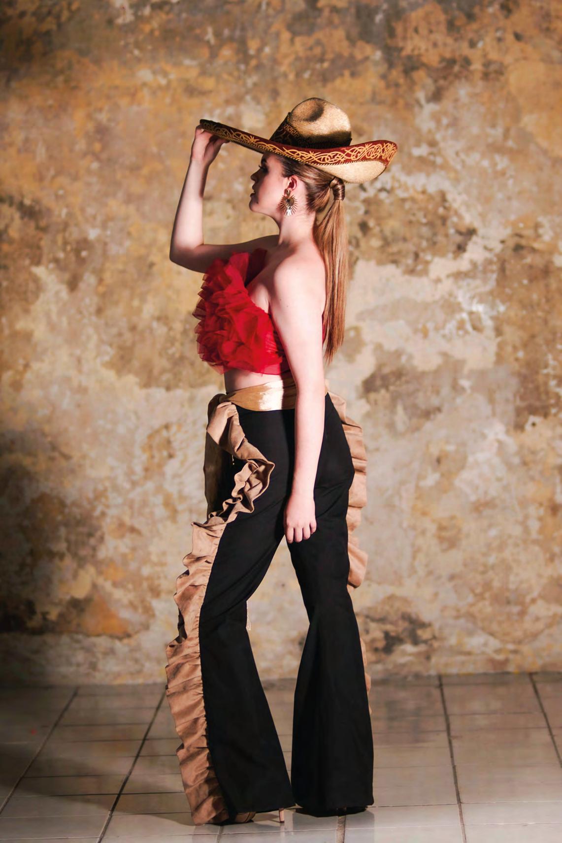 Conjunto de pantalón acampanado con escarolaras y top sin tirantes.