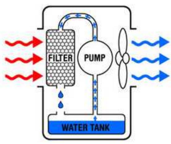 Dada la condición de la materia (gaseosa), es posible referir entonces un sistema de enfriamiento evaporativo, mismo proceso natural donde se utiliza la evaporación del agua como medio para enfriar el aire. Este enfriamiento se produce gracias a que el paso de agua líquida a vapor de agua utiliza calor para cambiar de fase pero sin aumentar la temperatura. Se produce un aumento porcentual de la humedad relativa del aire, perdiendo a la vez una parte de su calor, haciendo que descienda la temperatura.
