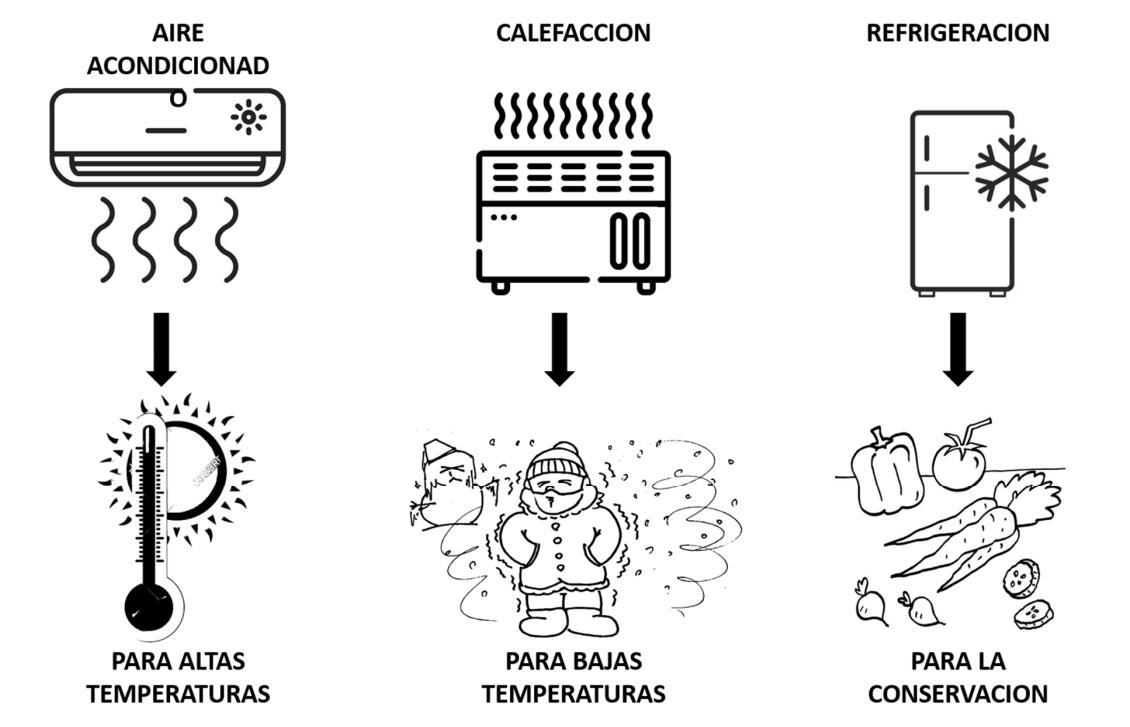 Es posible entonces, hacer una mención básica de los conceptos básicos conlos que se cuentan en el mercado para satisfacer necesidades climáticas, el aire acondicionado para climas con tendencia a las altas temperaturas, la calefacción para bajas termperaturas o poca incidencia solar, y la refrigeración para efectos de la conservación de alimentos u objetos de temperatura controlada (esculturas o incluso reposterías).