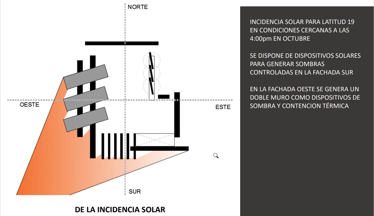 Entendiendo al sol como nuestro astro rey y como nuestra principal fuente de energía en el planeta, es posible referir entonces a la incidencia solar como la causante de la radiación solar, a myor incidencia solar, la radiación tenderá a aumentar si es que no se disipa. Es aquí donde, en relación con el objeto arquitectónico surge la pregunta “¿de dónde viene el sol? Toma relevancia, y es que, en relación a este único punto, se puede disponer de ciertos elementos que impidan o propicien su paso.