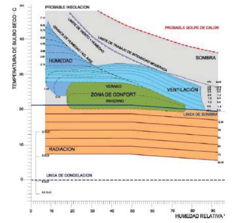 Fig. 1. Esquema del confort humano en términos físicos según Victor Olgyay, el confort entre el punto de congelamiento y la insolación. Elaboración propia.