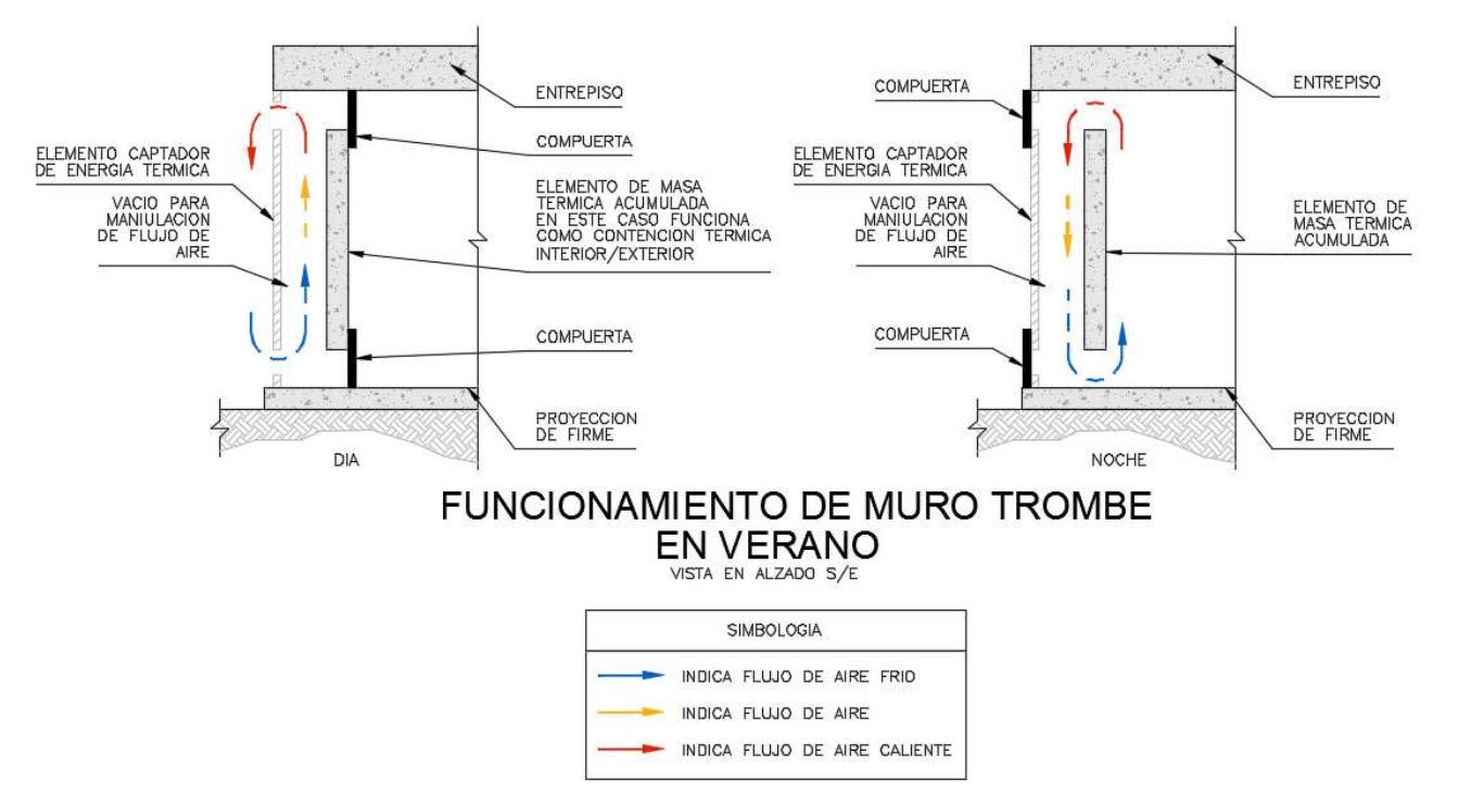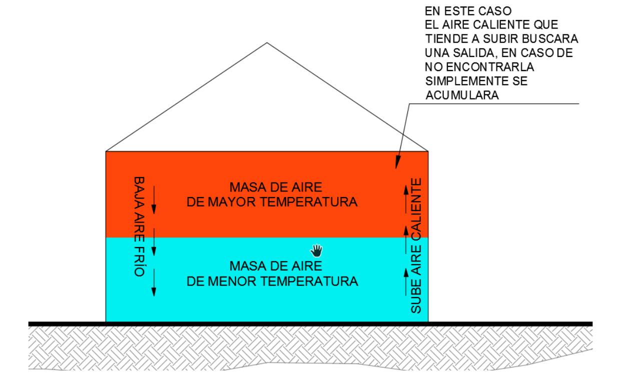 En el diagrama de funcionamiento convectivo, en un espacio con características habitables, podemos observar que dados los intercambios de temperatura, la masa de aire con mayor energía térmica (caliente) pierde peso, con esto incrementa su volumen y tiende a subir, mientras que la masa de aire con menor energía térmica (frío), en tanto tiene mayor peso que su contraparte, tiende a bajar. Este hecho físico se puede aprovechar y manipular en la práctica arquitectónica dando salidas lógicas a las masas de aire caliente para evitar el acumulamiento de energía térmica (radiación), así como generando entradas estratégicas que permitan un confort.