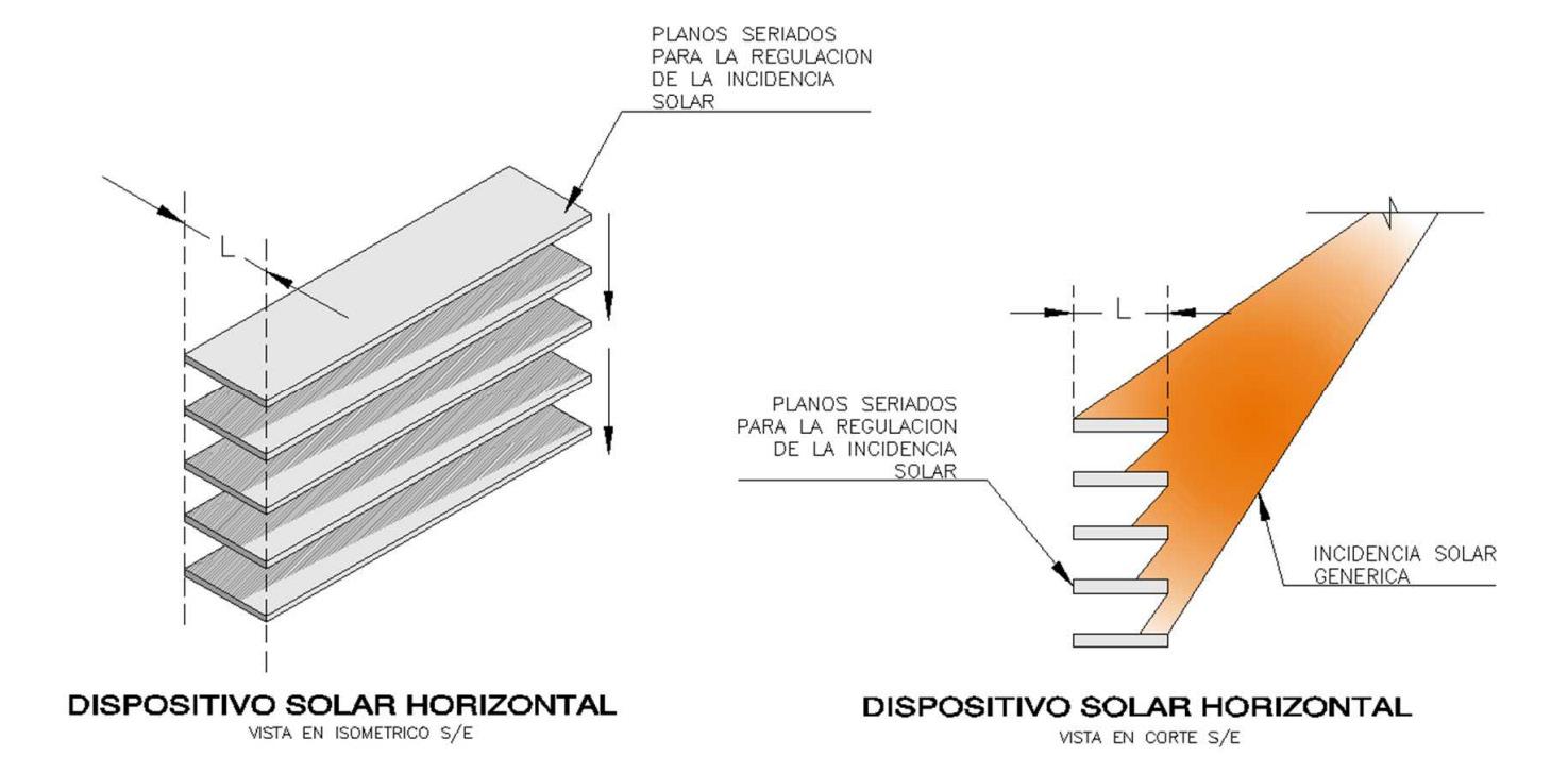 Se presenta la figura 14, donde el número de planos seriados que puedan interceptar la incidencia solar será proporcional a la altura del objeto o fachada donde se pretenda colocar, mientras que la longitud “L” estará dispuesta según el ángulo de inclinación solar y el criterio que tome en relación a este, es decir, hacer que haya entrada de rayos del sol o no, en menor o mayor medida. Estos dispositivos obtienen un mayor valor cuando se les emplea (en latitudes cercanas a 19º) en orientaciones sur, que es donde el recorrido solar tiende a un ángulo frontal.