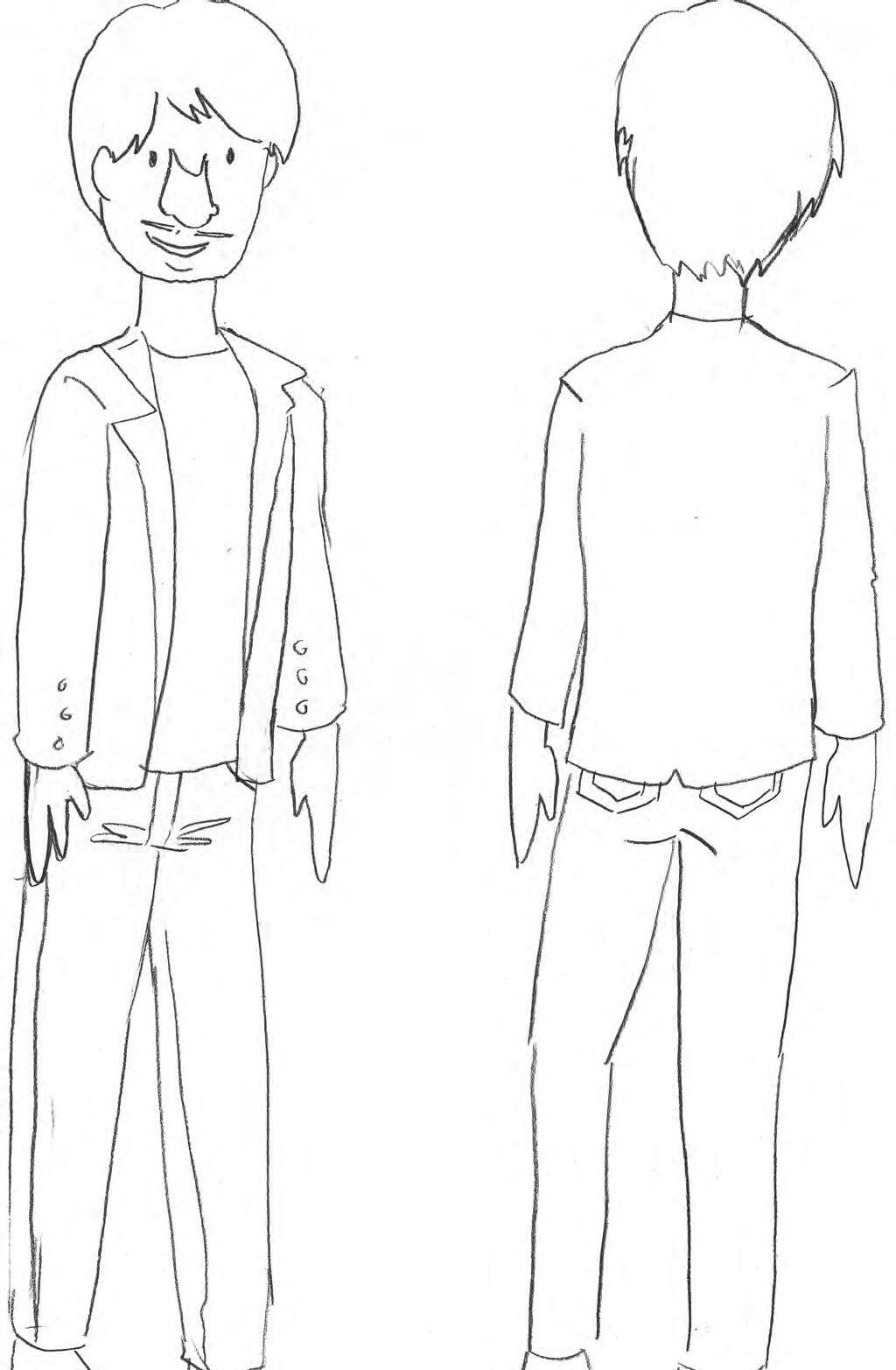 Boceto de un personaje desde cuatro vistas, frente, vuelta, 3/4 y de espalda.