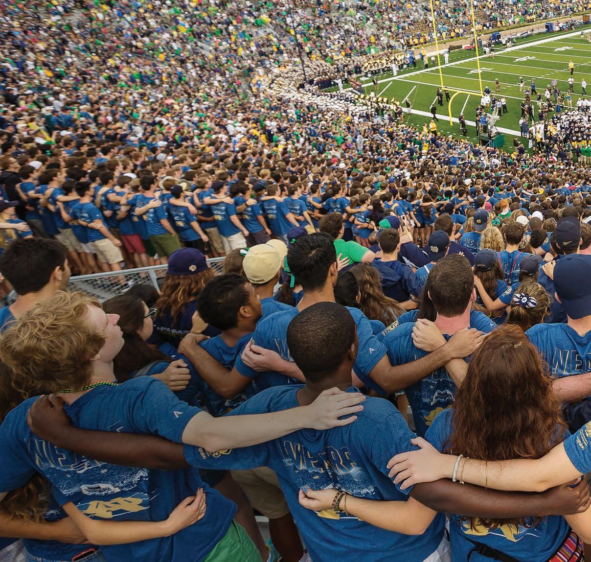 There’s something profoundly special about being a Domer that every student understands but may struggle to put into words. But this something special is seen and felt by all when students put their arms around each other’s shoulders to sing “Notre Dame, Our Mother,” also known as the “alma mater,” after every football game in the 80,000-seat Notre Dame Stadium. Win or lose, the Fighting Irish join their voices with the Notre Dame band and sing. The song is a celebration of their camaraderie, of friendship, and of their place in the legacy and lore of the University of Notre Dame. “Proud” doesn’t begin to describe it.