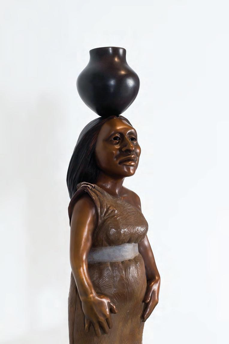 In Santa Fe, I would assist Aunt Suzan driving her to gallery shows, exhibitions, artists talks, and forums where she would panel and I could quietly observe and admire all the amazing art and people around me. One of the most memorable trips we took was driving to Tower Gallery, just outside of Santa Fe where we visited her dear friend, Roxanne Swentzell. I would wander around the gallery while they caught up, listening in on their shared stories and laughs. Indigenous women laughing is such good medicine! Years later, it is truly an honor to present Roxanne Swentzell’s A Question of Balance, a bronze sculpture of a woman standing tall and proud with her hands lowered just beneath her abdomen over traditional Santa Clara Pueblo attire. A single, large piece of pottery rests squarely on the top of her head, perfectly balanced; it will never fall. She is pleased, strong, confident, and vulnerable at the same time. This art emotionally connects me to my dear Aunt and to Roxanne Swentzell’s daughter, Rose B. Simpson.