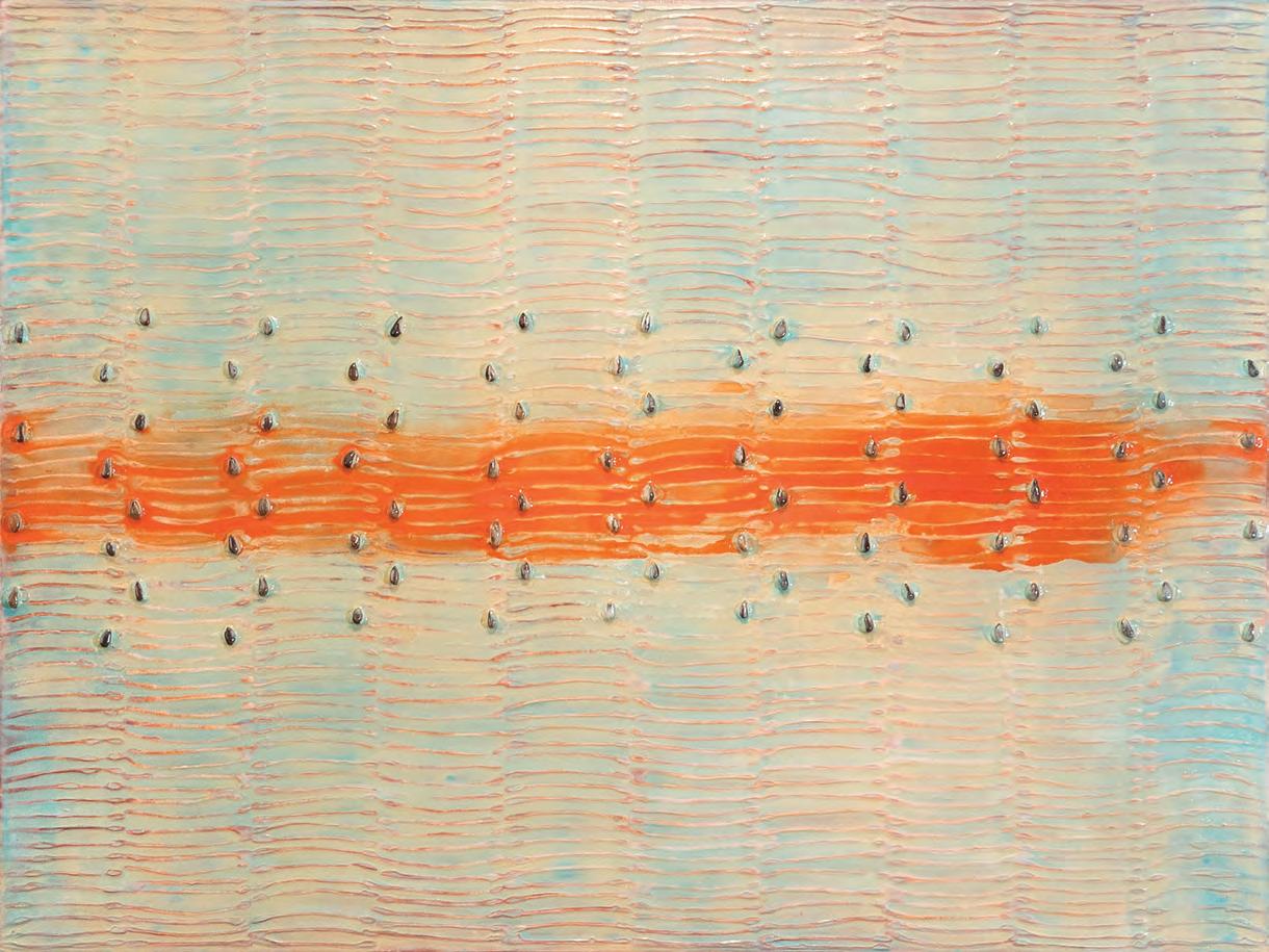 Melissa Melero-Moose’s mixed media paintings, Access Denied (2020) and Making a Burden Basket (2021), speak to the influence of limited access to natural resources. Melero-Moose is a member of the Fallon Paiute-Shoshone Tribe, and she resides on the Reno-Sparks Indian Colony near Sparks, Nevada. Melero-Moose founded the Great Basin Native Artists Collective. Like Douglas and Burden, Melero-Moose abstracts place, identity, and memory in her work. In an email, Melero-Moose explained that her mixed media work Access Denied “is about limited representation at positions of power and the visibility of Indigenous artists, and the imagery is about the barb wire that separates a lot of Native peoples from access to the willow, pine nuts, and water on our homelands in Nevada, which is the essence to our traditions and survival.” Her pieces Rearranging and Making a Burden Basket are, “both an interpretation and abstraction of the basket texture and culture, pine nuts, colors of the Great Basin and mixing that visual into a new memory and respect for place.”6 In conversation with Douglas’s and Burden’s baskets across the entryway of the Donna Beam Gallery, she abstracts adaptability and resilience by explicitly highlighting the lack of access and the determination of facing burdens through her use of desert yellows, oranges, and greens in conversation with Indigenous pine nuts.