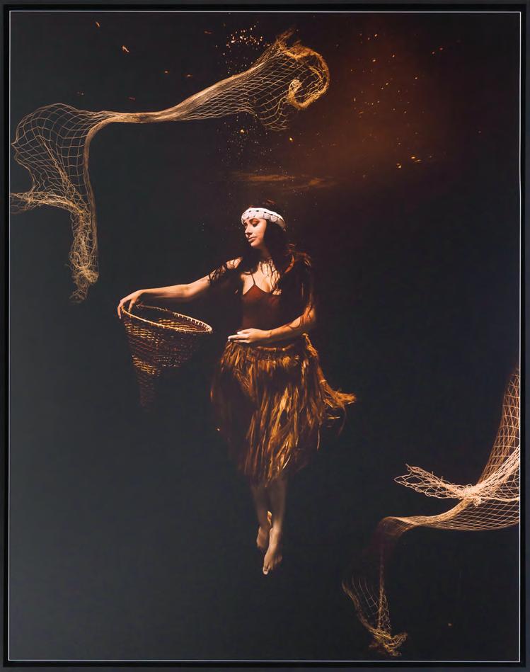 next to Swentzell’s sculpture, Romero’s photos create a visual reflection on how Indigenous women’s balance is as much about what they carry and where, as well as how they dance. Her photo WESHOYOT (2021) featuring a woman underwater, holding a basket surrounded by fishnets, converses with A Question of Balance by positioning the basket to the woman’s left in contrast with the basket Swentzell’s’s figure holds on her head. The figure’s movement expands on the adaptability of Indigenous women as demonstrated throughout the show, emphasizing the many ways to carry the stories they tell. Next to WESHOYOT, GAEA’s (2021) figure is dancing in ballet slippers on the sand reminding us that joy, dance, and play are equally important. The embodiment of Mother Earth, a shared source of inspiration for many of the artists, depicting her in dance, in joy, speaks to the beauty and wonder that drives Romero’s ethical impulse to counter dominant narratives of Indigenous women.