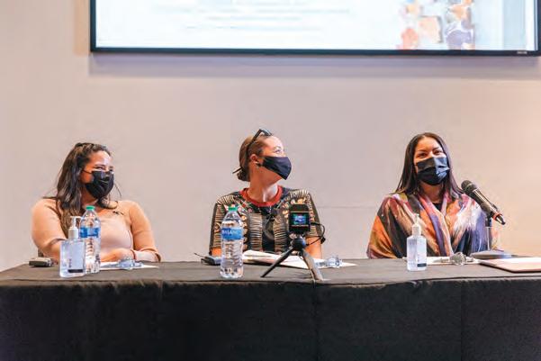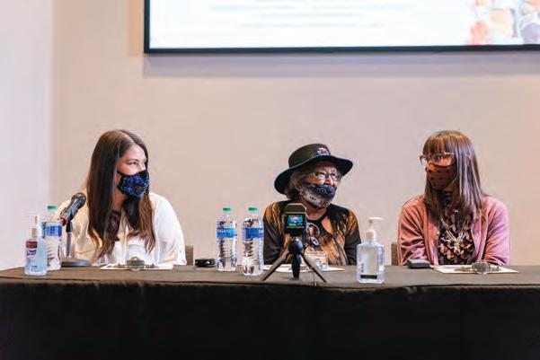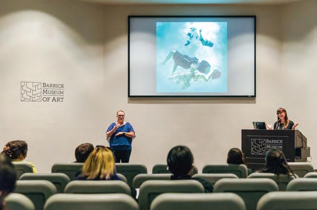 Clockwise from left: Cara Romero, Artist Lecture; Symposium Panel, Noelle Garica, Loretta Burden, Cara Romero; Symposium Panel, Natani Notah, Rose B. Simpson, Fawn Douglas; Stacey Montooth, Nevada Indian Commission, speaks about Stewart Indian School at the Paul Harris Theatre.