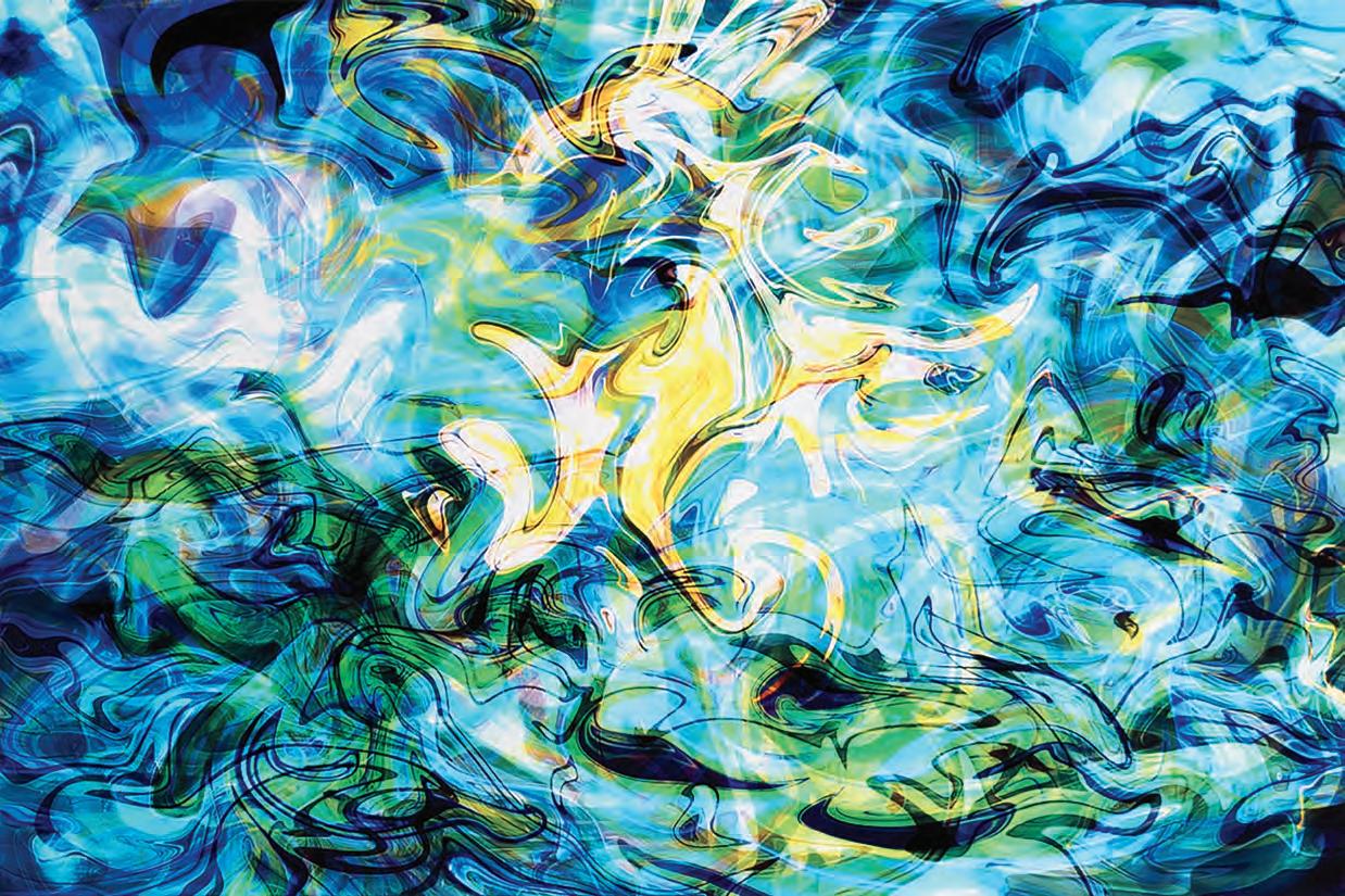 Shelby Westika’s (Zuni Pueblo) pieces similarly explore the worlds around them, with attention to the modern and digital worlds in which they play. Westika writes that both the mixed media piece, Dream (2020), and digital painting, Eye of the Storm (2021), “connect the visuals of gaming, music, and my emotions in a painting. Both build a harmonious melody that embodies the rhythm of the music and sounds from the game and clicks of the keyboard