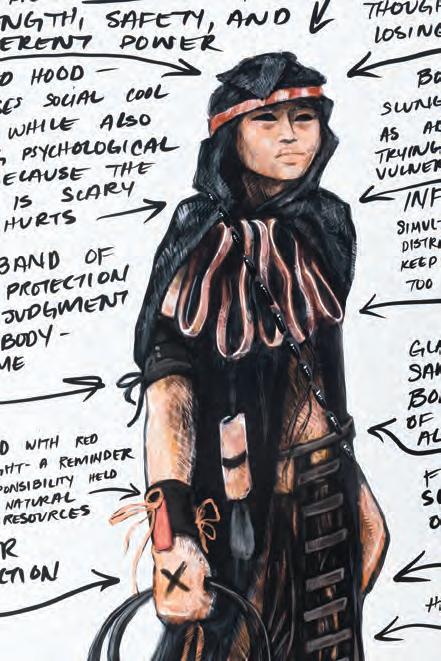 Rose B. Simpson’s (Santa Clara Pueblo) sculpture in the exhibition, Innate (2021), clothed in protective gear may appear to expand upon the message of the artist’s 2014 Maria. With Maria, Simpson, “craft[ed] post-apocalyptic Indigenous warrior accouterments out of leather, metal, found objects, and ceramic components.”20 On further discussion, however, Simpson and Douglas explained that Innate was not supposed to be displayed wearing the protective gear. The accompanying drawings of the clothed figure were meant to function as a key to the, “protective crap’s meaning and what the figure would have looked like adorned with it.”21 In other words, while Maria was centered on showcasing protection, Innate was supposed to depict vulnerability. Completed days before being delivered to the show, Simpson’s Innate intends to move beyond what Maria had done. The accouterments were supposed to surround the figure instead of it being adorned. Simpson intended to have the Innate sculpture unwrapped and posed in between images that explained the figure’s, “transition from feeling the need to ‘protect’ oneself with warrior imagery or ‘stuff.’”22 While Douglas explained that she offered to remove the adornments after the symposium, time hadn’t permitted it, and Simpson decided to leave it as is. I followed with her regarding how she felt about the piece not being displayed as she intended,