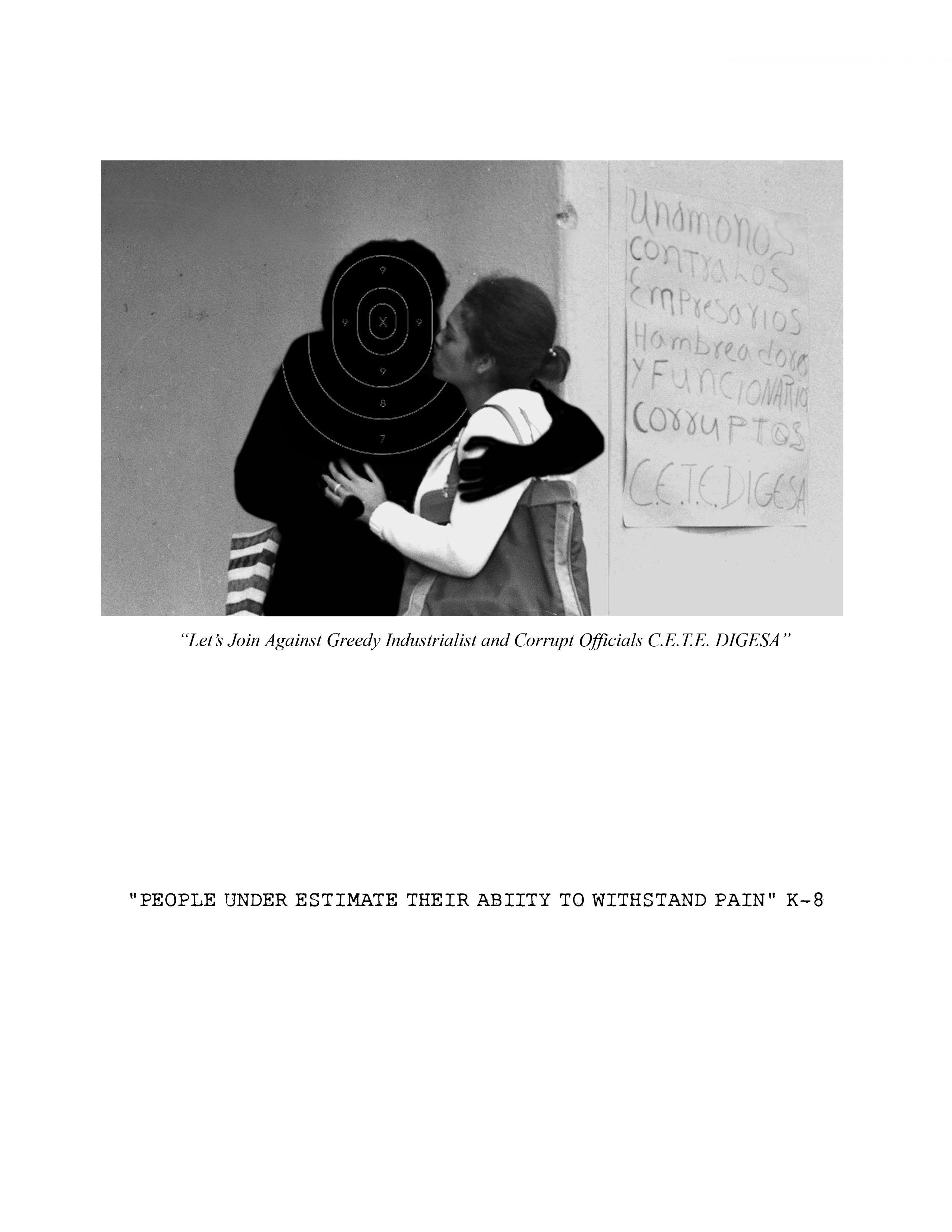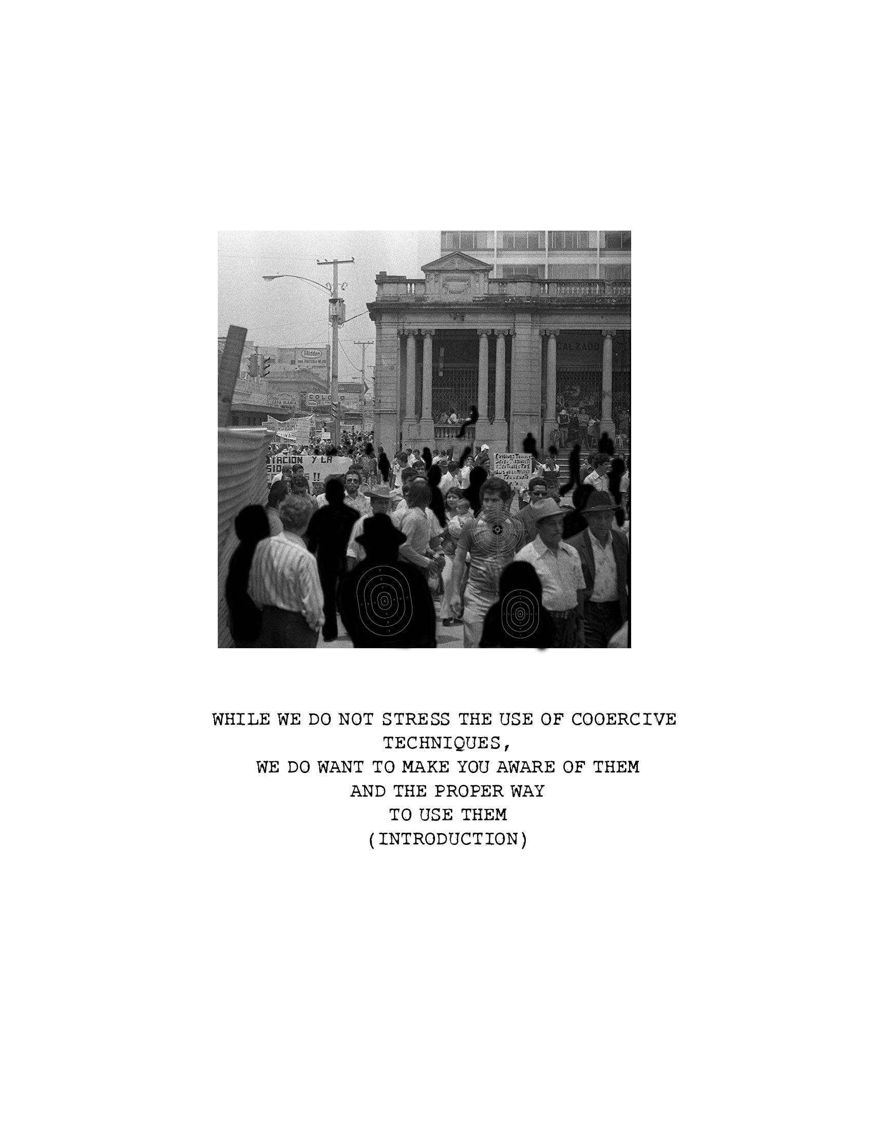 I first came across the Human Resource Exploitation manual as a result of wanting to know more about el terror that I heard in her voice when she talked about the months in hiding. The manual was a teaching tool used in the School of the Americas—a United States Army Center—to teach Latin American military personnel how to deal with insurgents when they are detained. In other words, how to torture people. When I read the copies of this book, I was shocked at how institutional language was being used to mask torture. The subjects of the detainment weren’t referenced as humans. They were bodies meant to be broken into submission. A clear subtext of inhumanity emerged between the typeface and marginal notes. These were not people; they were bodies meant to be used and discarded.