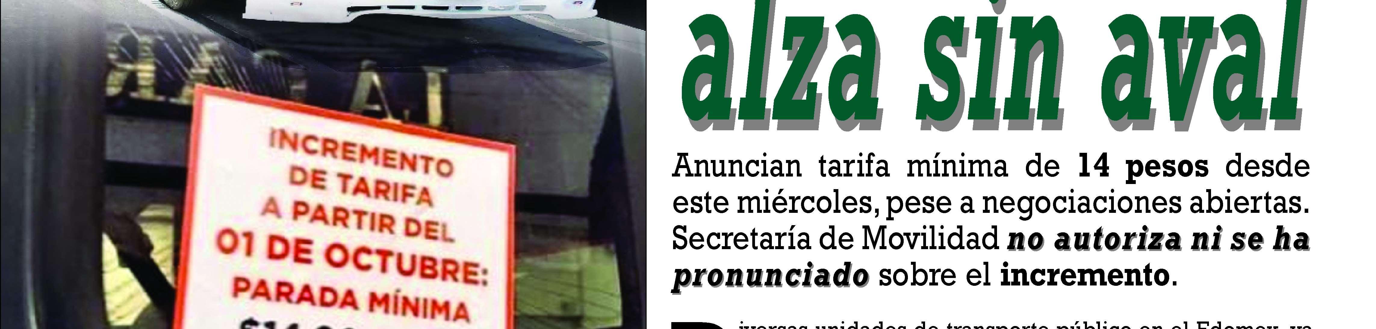 iversasunidadesdetransportepúblicoenelEdomex,ya anuncianunaumentonoautorizadoenlatarifamínima delpasajede12a14pesos,apartirdehoy1deoctubre; mientras,continúanlasnegociacionesconelgobiernoestataly sinavaloficialdeMovilidad.