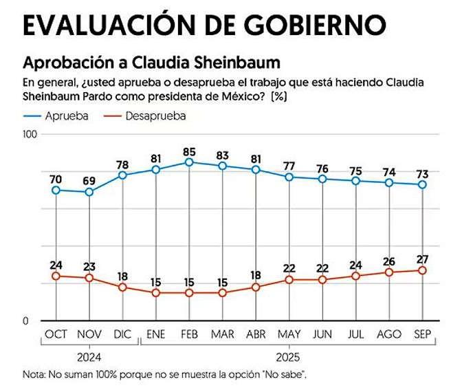 En contraste con esta visión sobre la corrupción, resaltan varias encuestas de diversos medios de comunicación, cuyos sondeos señalanquelapresidenta ClaudiaSheinbaum,regis73 % de aprobación trasun año de gestión. Esta cifra coloca a Sheinbaum cinco puntos por encima de la aprobación que tenía Andrés Manuel López Obrador al concluir su primer año en 2019, uno de los presidentes más populares en el inicio de su mandato.