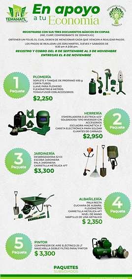 A través de esta iniciativa,las familias de Temamatla y delegaciones podrán recibir paquetes subsidiados de herramientas,insumos,muebles para baño, tinacosparaaguayequipamientopara emprendedores, como parte del programa que permanece activo en este municipio,promovido por lasylos legisladores de la entidad a precios preferenciales como parte de acciones socia-
