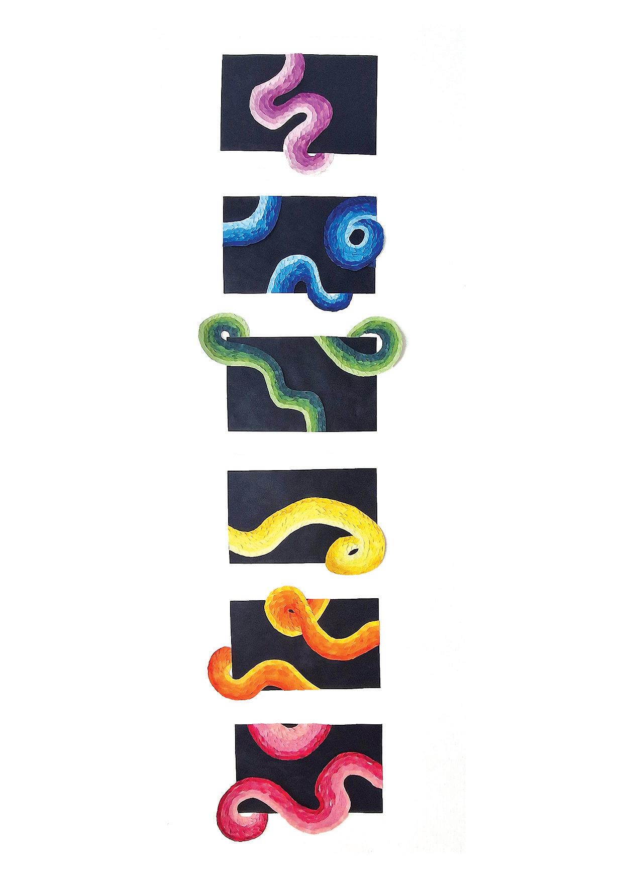My work is inspired by mythology and folklore, especially that of serpents. I am also inspired by the work of abstract artists that came before me as I always look to learn and grow as an artist. Serpents are an important piece of symbolism in many cultures, from being linked to healing to being slain in legends, the serpent is a creature associated with both negative and positive connotations depending on interpretation. In many places, they are associated with the cycle of life and death, as well as rebirth and creation. Within my work, precision and detail are both key elements, using many pieces to make a whole picture, I use contrast and texture to make this more apparent. Audience interaction with my pieces, both verbally and physically, is something that is very important to me.