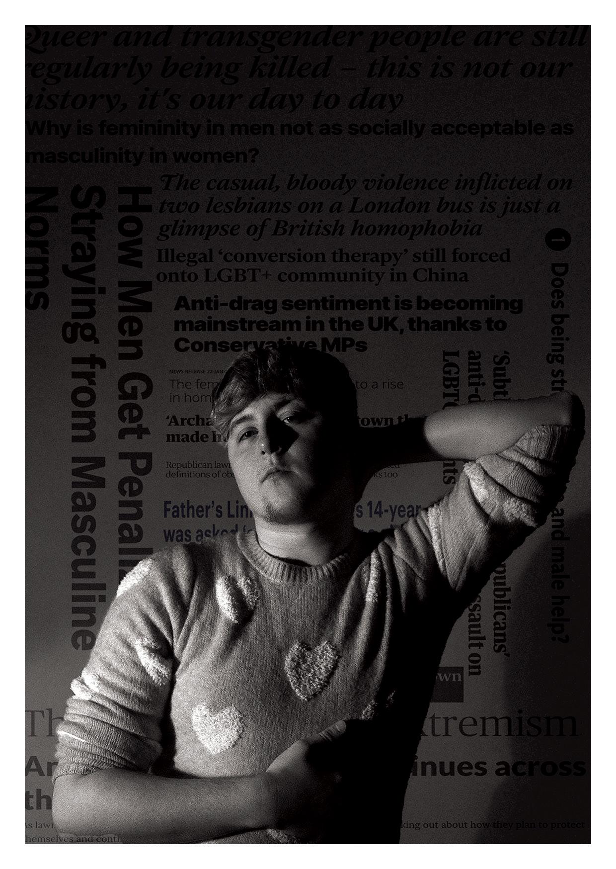 This project aims to face the negative comments on certain communities in a front on approach. The area this project delves into is the negative comments about women in sports, anti-LGBTQ headlines (pictured here), and men’s mental health. The aim of these photographs is to show that these negative comments won’t affect them in the way they desire, and that they can overcome them.