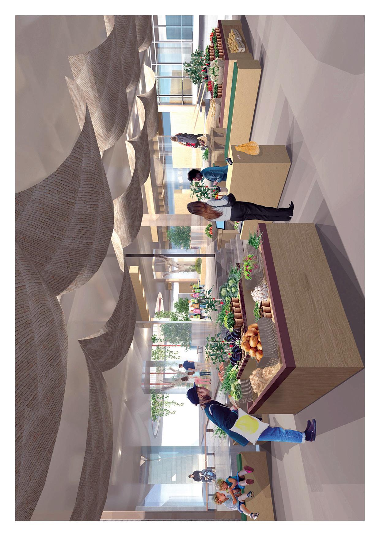 ‘Green City’ - Climate change is affecting farmland, the quality and supply of food, and thereby the population is seeing a spike in the cost of living, which rose 5% in February 2024. Partnered with a rapidly growing urban population, this is impacting the environment and society. Phylla is an initiative to tackle both the shortage of fresh produce and to help aid those that are struggling to afford to eat healthier. Phylla philosophy endears to the circular economy by minimising the impact on the community and environment by integrating sustainable practice that emphasises community development. The experience includes a social supermarket and demonstration kitchens with produce from hydroponics, aquaponics and vertical growing systems on site. Educational hubs provide valuable information, promoting health and well-being from nutrition to life skills, interweaving agriculture and education into residential and commercial life. Inspired by nature and sustainability, it utilises a rustic appearance with sophisticated details and materials including biomaterials such as hemp, wood, cork, mycelium and an abundance of fresh growing produce.