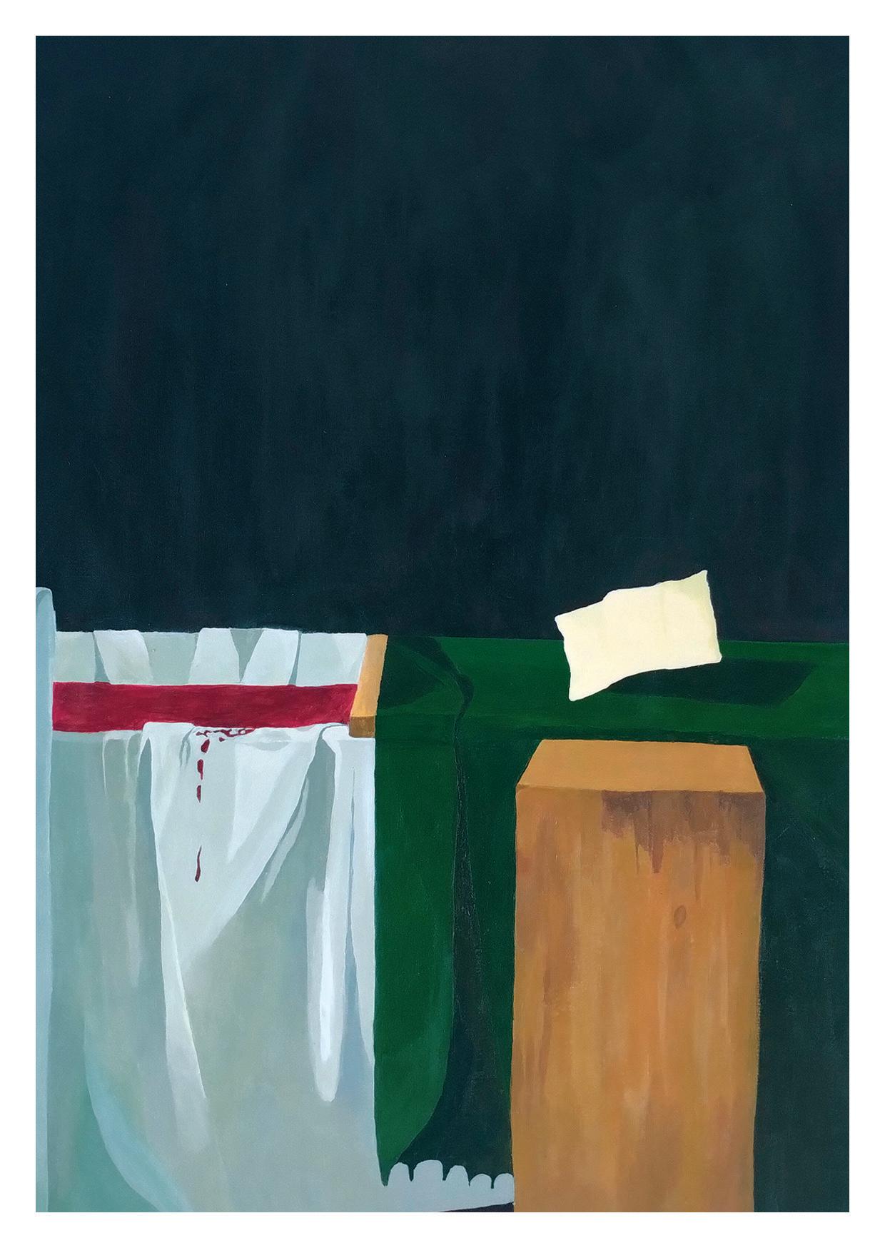In my Fine Art practice, I’ve been investigating the consequences of eliminating figures from famous paintings. I started by looking at a painting where the figure is a massive part in the story of the painting and then I explored the impact of their absence. This is Jacques-Louis David’s ‘The Death of Marat’ and I have removed Marat from the composition. This dramatically altered the painting’s narrative and revealed a captivating new story. This process led me to question: Does the removal of figures diminish the painting’s significance? This is a question that continues to drive my artistic exploration. I also alter the pieces further by subtracting (and in some cases, adding) different elements and changing the colour of some elements to tell a new story.