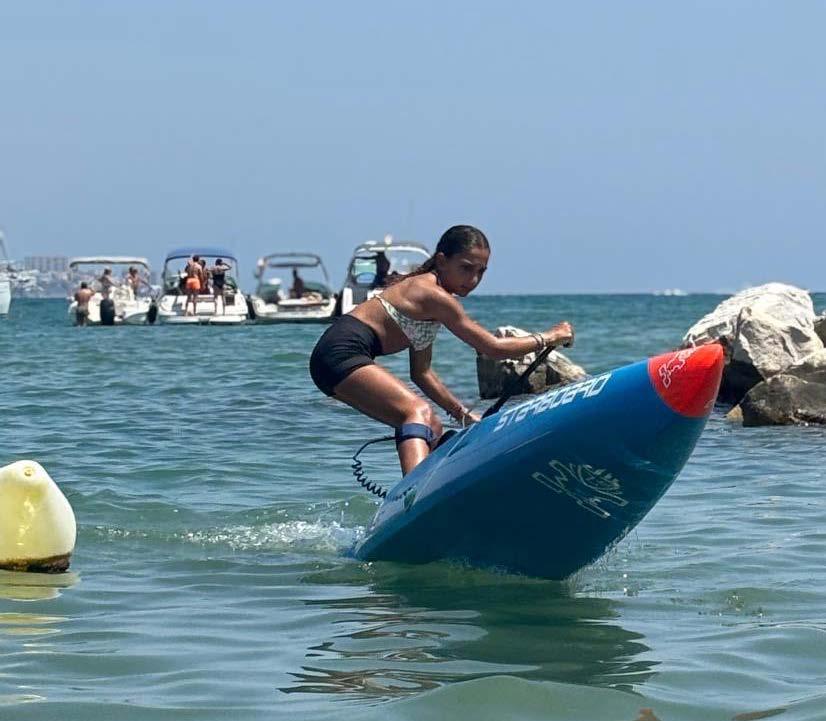 Hola tengo 11 años, soy de la cala de Mijas y comencé a practicar paddle surf el año pasado, ya que mi madre llevaba un tiempo practicándolo y me convenció para entrenar con ella.
