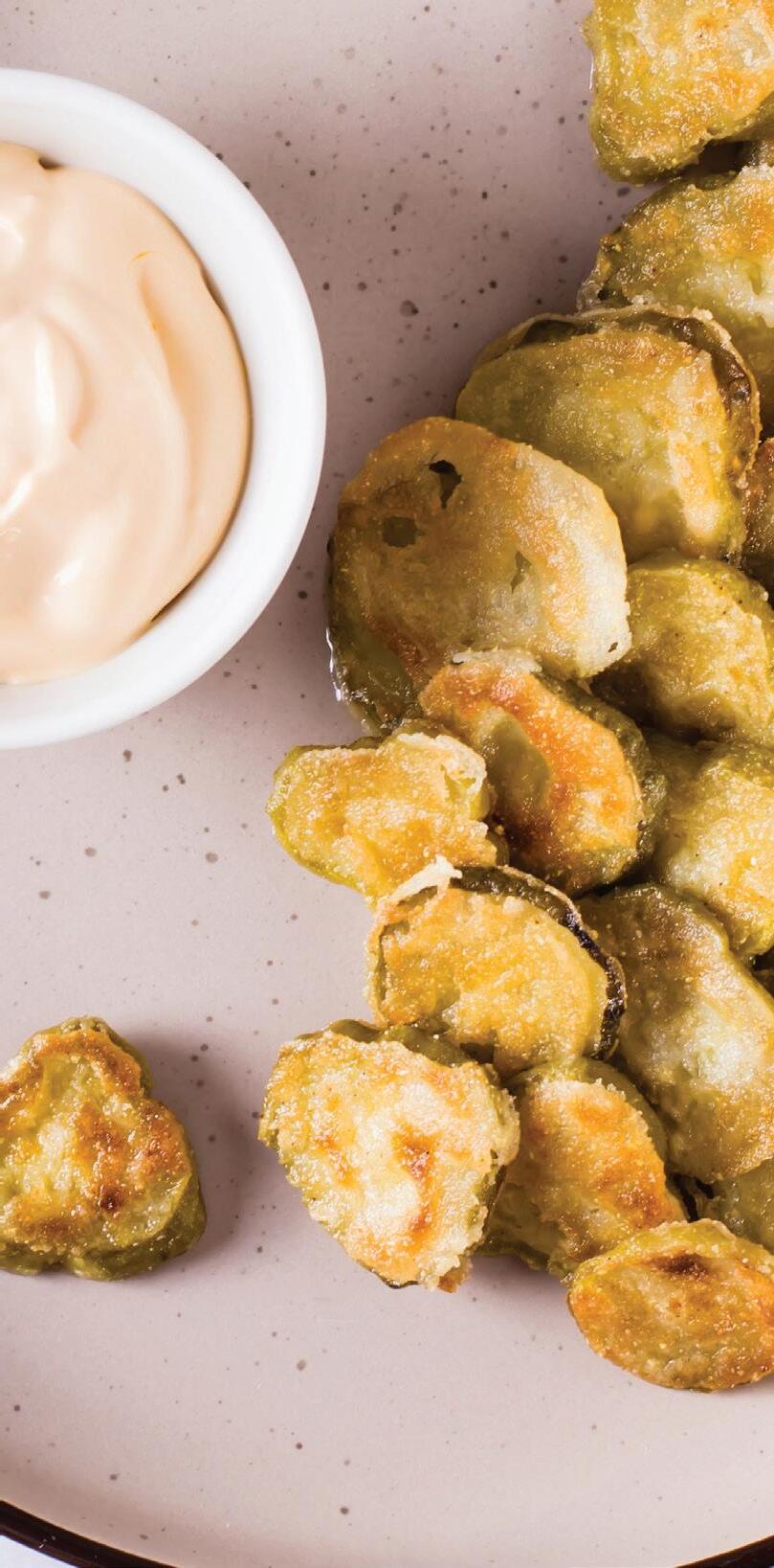 3. In a deep pan or Dutch oven, heat 1 inch of oil to 375°F. Fry pickles 2-3 minutes on each side or until golden brown. Drain on paper towels. Serve immediately with dressing of choice.