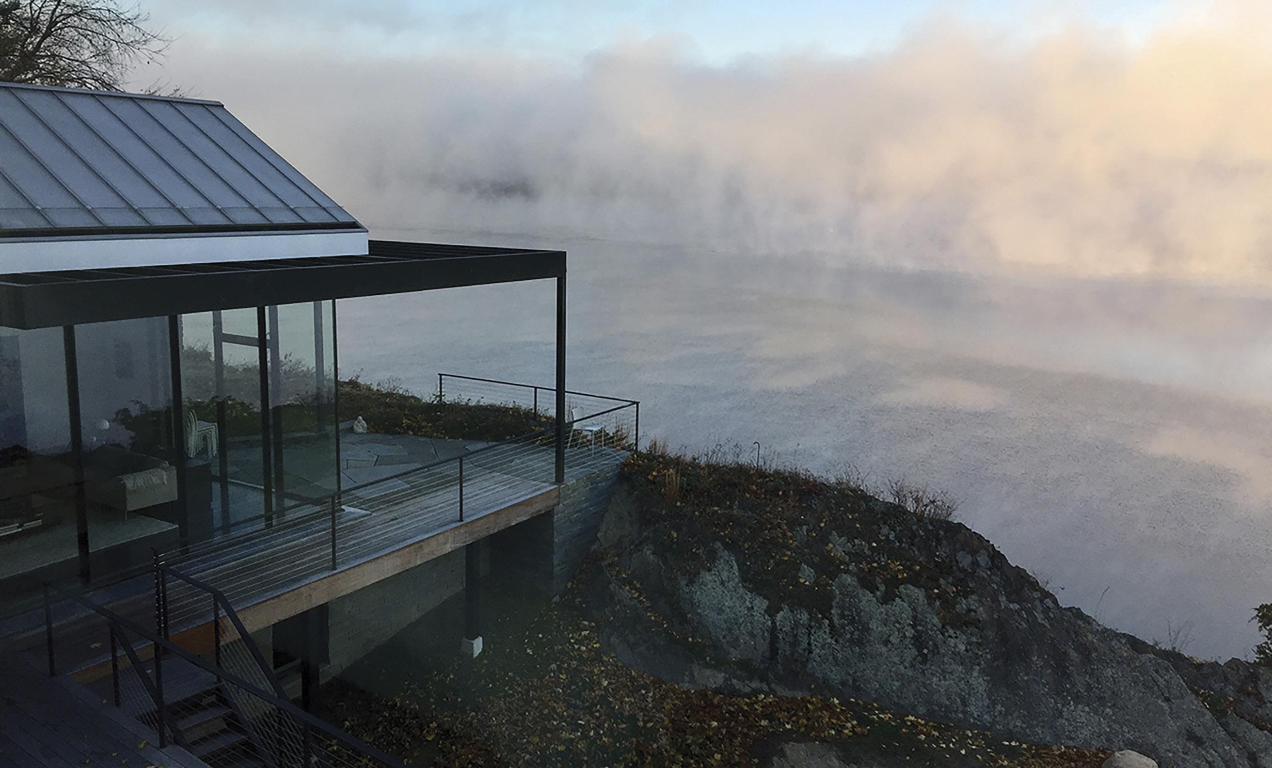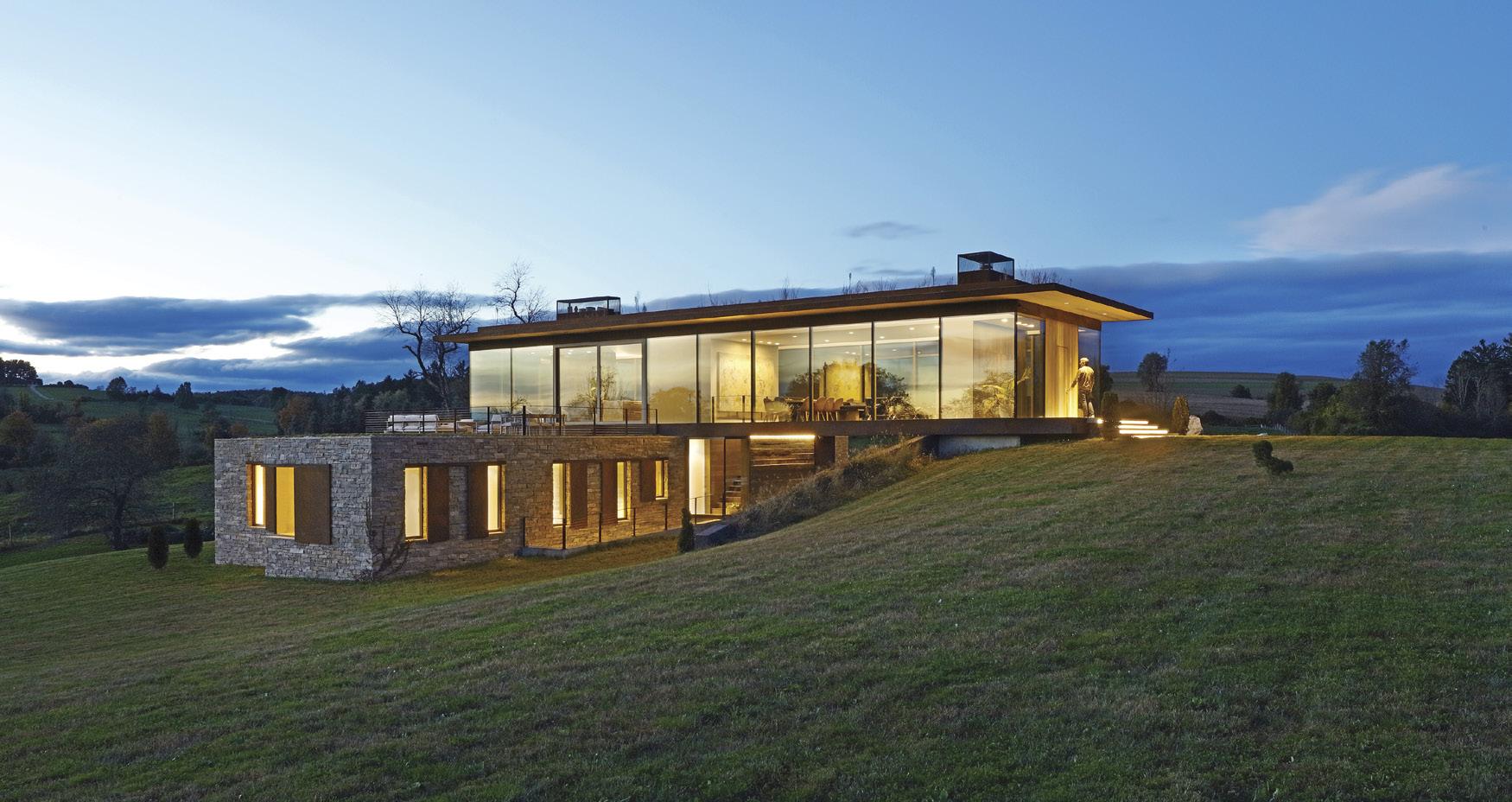 The exposed, transparent glass portion of Link Farm House— a space for cooking, entertaining, and gathering—overlooks the private stone portion below where the bedrooms are located.