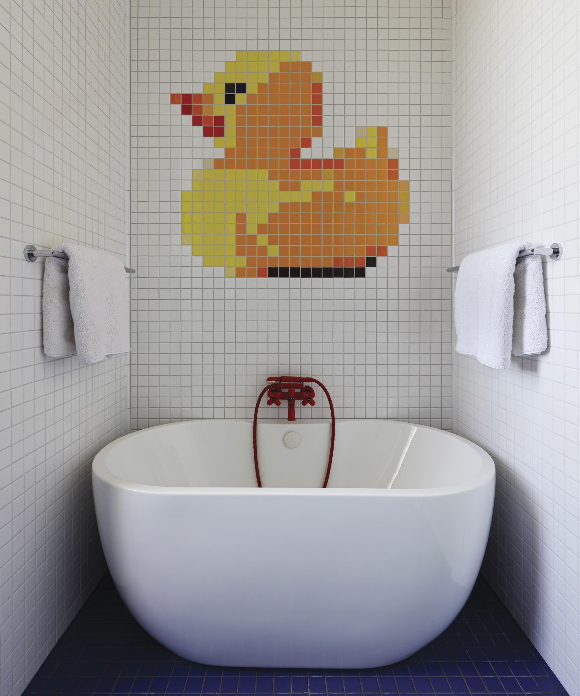 A mirrored wall reflects sunlight through the space and creates an office nook. Tucked behind, the primary suite looks onto a grove of trees. The bathroom is accessed by passing through a walk-through closet. Storage space is one thing the minimalist designer is a maximalist for. “I always add more storage than people think they need,” she explains. “It keeps things from getting messy and you always manage to fill it.”