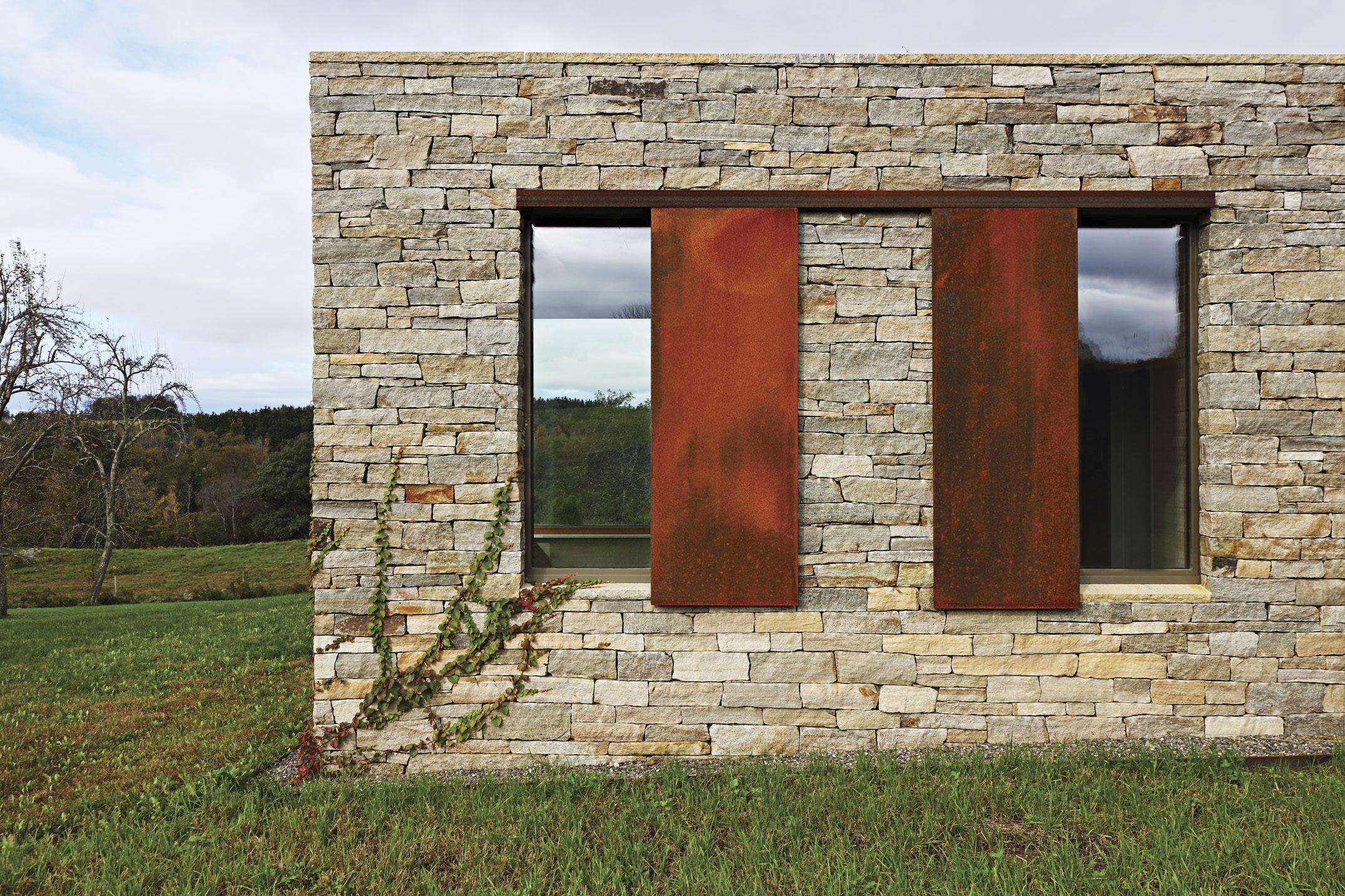 The stone portion of the house is peppered with Corten steel shutters, which naturally develop a rust-like patina over time.