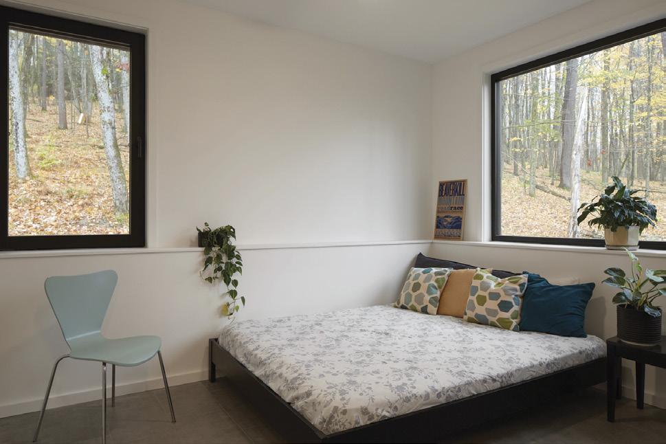 penetration and heat gain in winter,” notes the Slades’ website. Downstairs, ultra-insulated walls and windows—not to mention the stone flooring throughout, which “creates a thermal flywheel”—collectively serve as a heat barrier to stabilize the inside temperature.