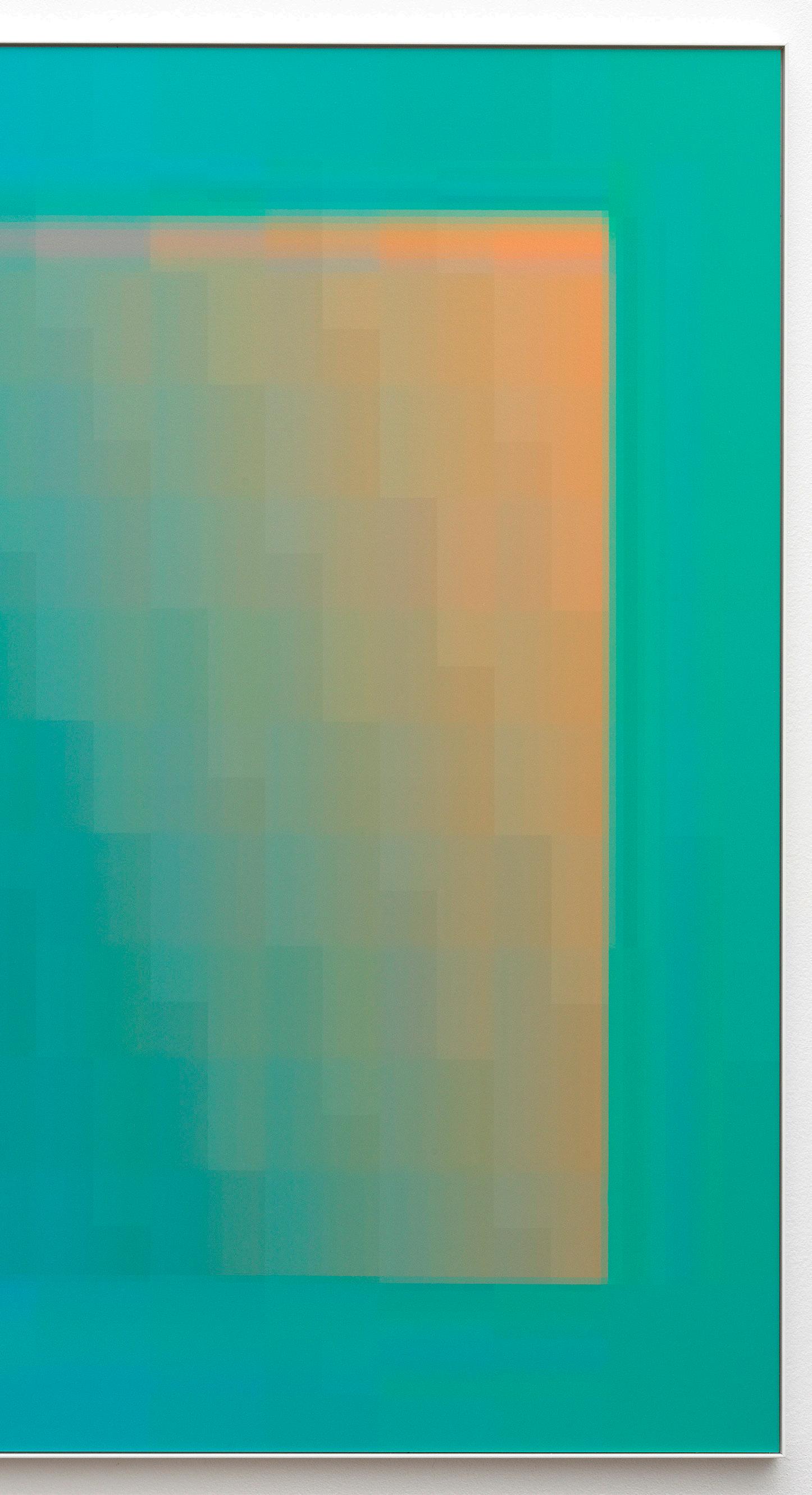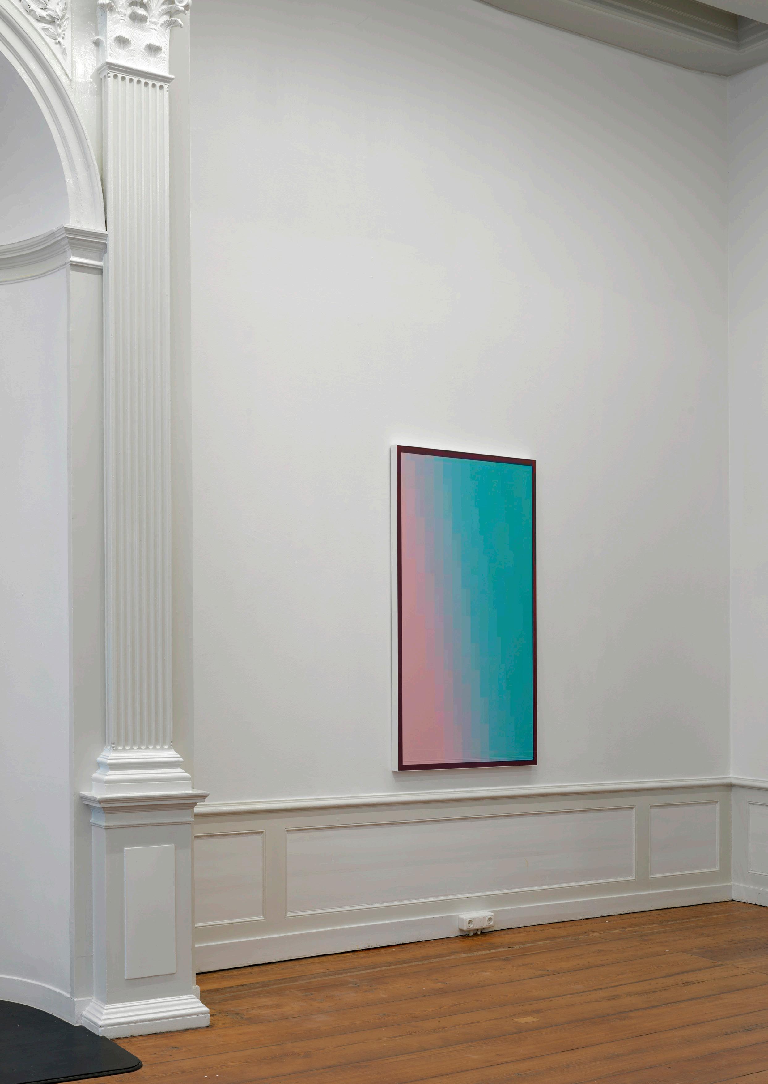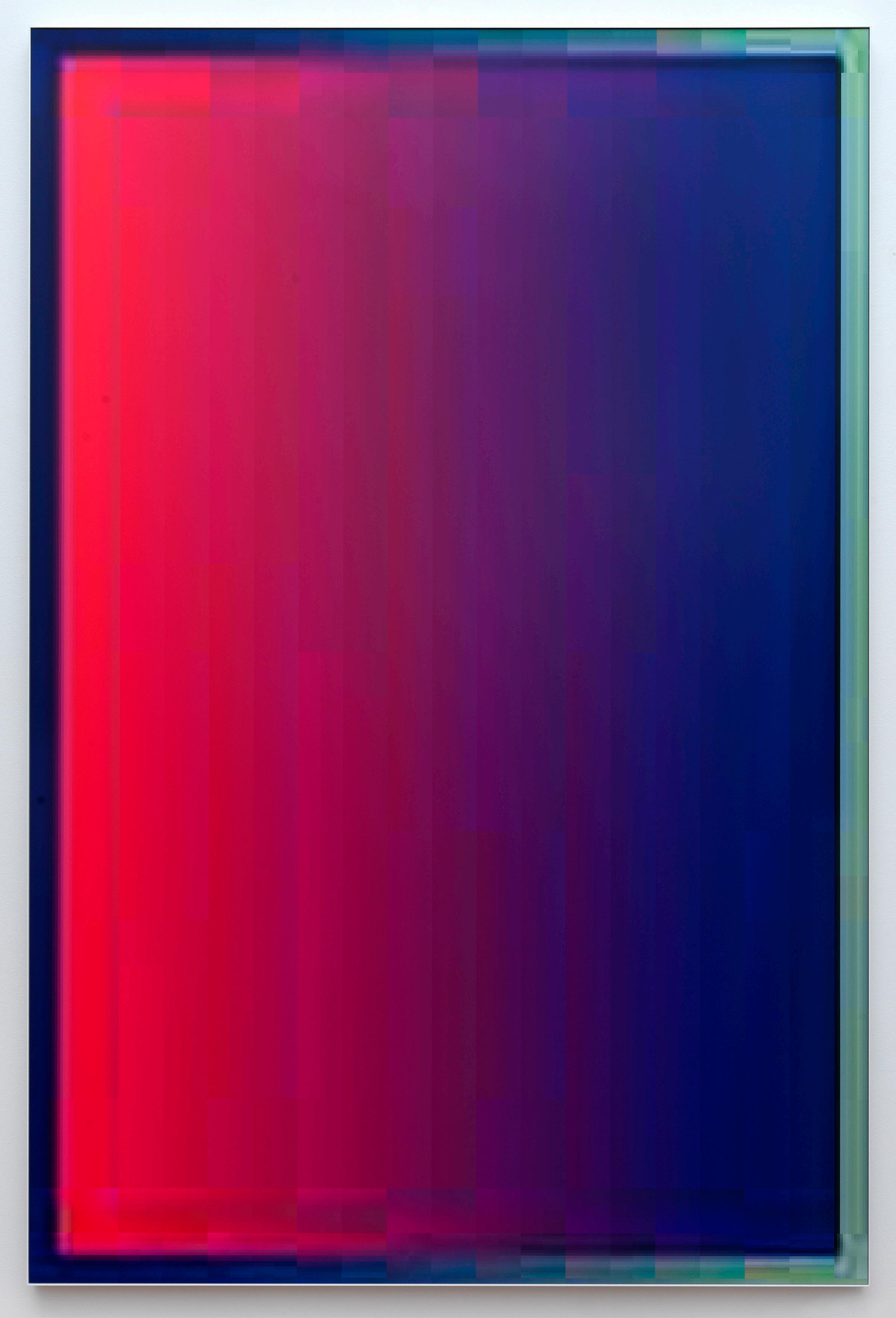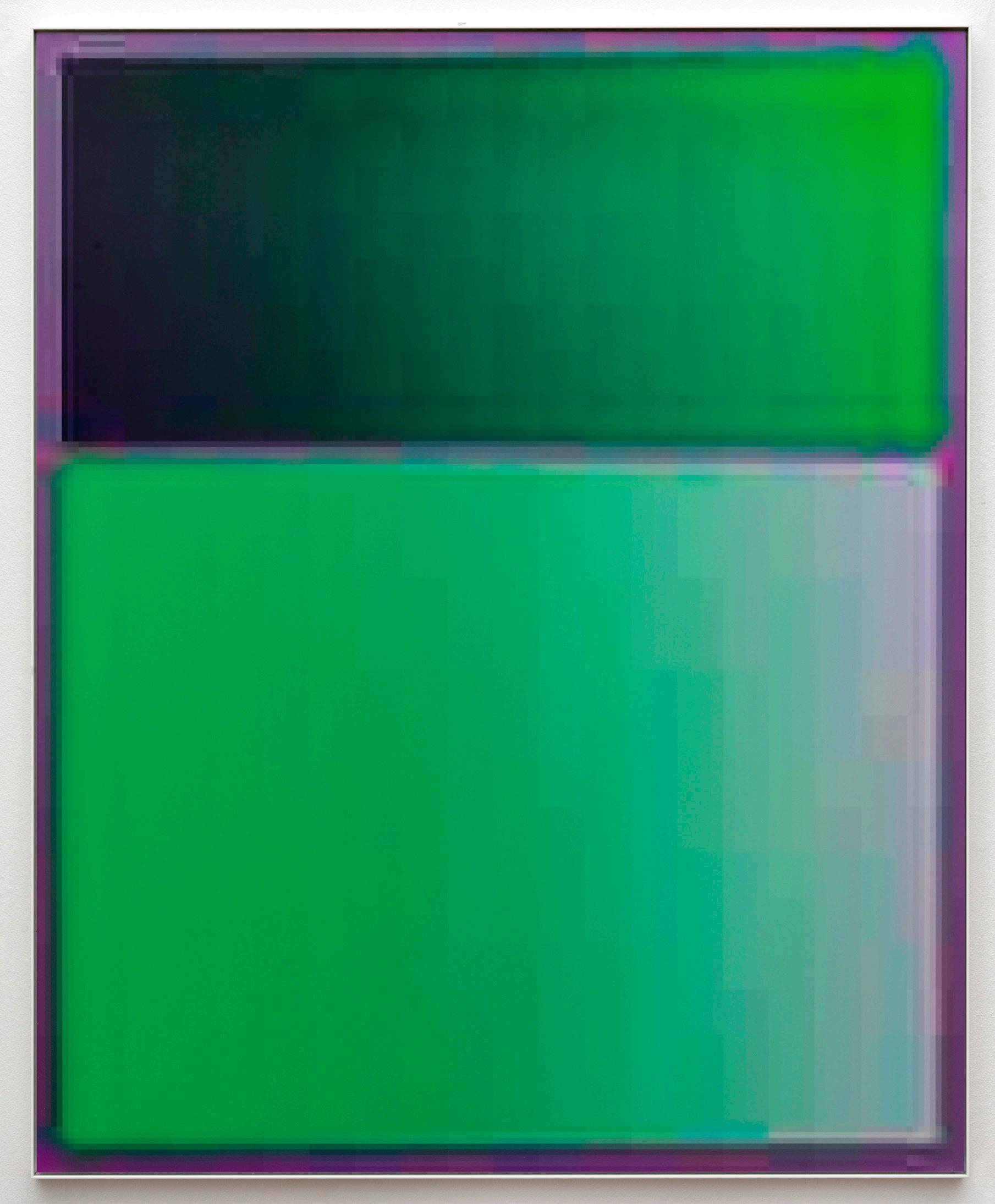 The works from the JPEG series try to create an image programmatically fully expressing that signature compression. An image that is made from barely nothing, yet fully present in its blazing appearance. A work deeply material, expressing itself through the language of code and codec transferred to a plate of aluminum. This is not a JPEG depicting an image. The JPEG is the image itself.