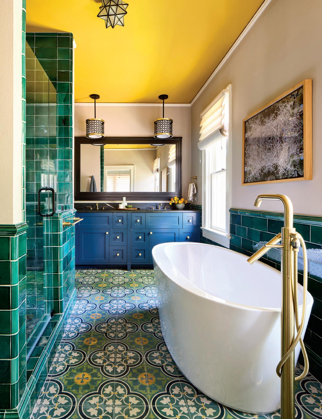 “I love the flow of the upstairs suite now,” she said. “For the bathroom, Am ity chose these gorgeous emerald tiles for the wainscotting and this bright yellow for the ceiling. The client loved the color palette, and it’s actually very accurate for the era of the home!”