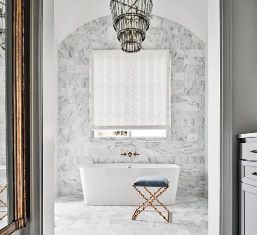 Dianne reworked the home’s layout, removing an antiquated secondary staircase to make room for a glamorous downstairs powder room. She recon figured the upstairs floor plan, expand ing the guest bathroom, doubling the size of the primary closet, adding two private office spaces, creating a bright laundry room and reclaiming a sleep ing porch to accommodate a gorgeous primary bath.