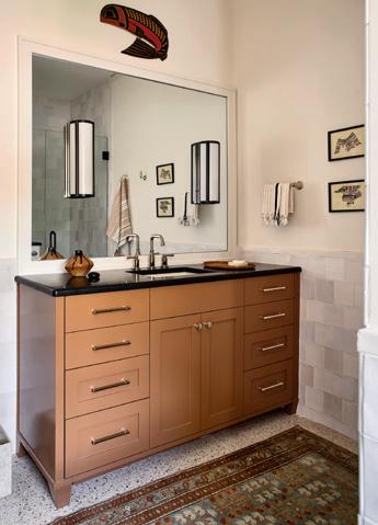 Dianne and her team reorganized the downstairs layout to accommodate an oh-so-stylish powder bath where the former secondary staircase once stood. While small, the space packs a big style. Amity selected a Spanishinspired wainscotting tile from Design Material Inc. for the lower half of the walls, while antiqued mirror clads the upper half on all four sides — surrounding guests with 1920s glamour.