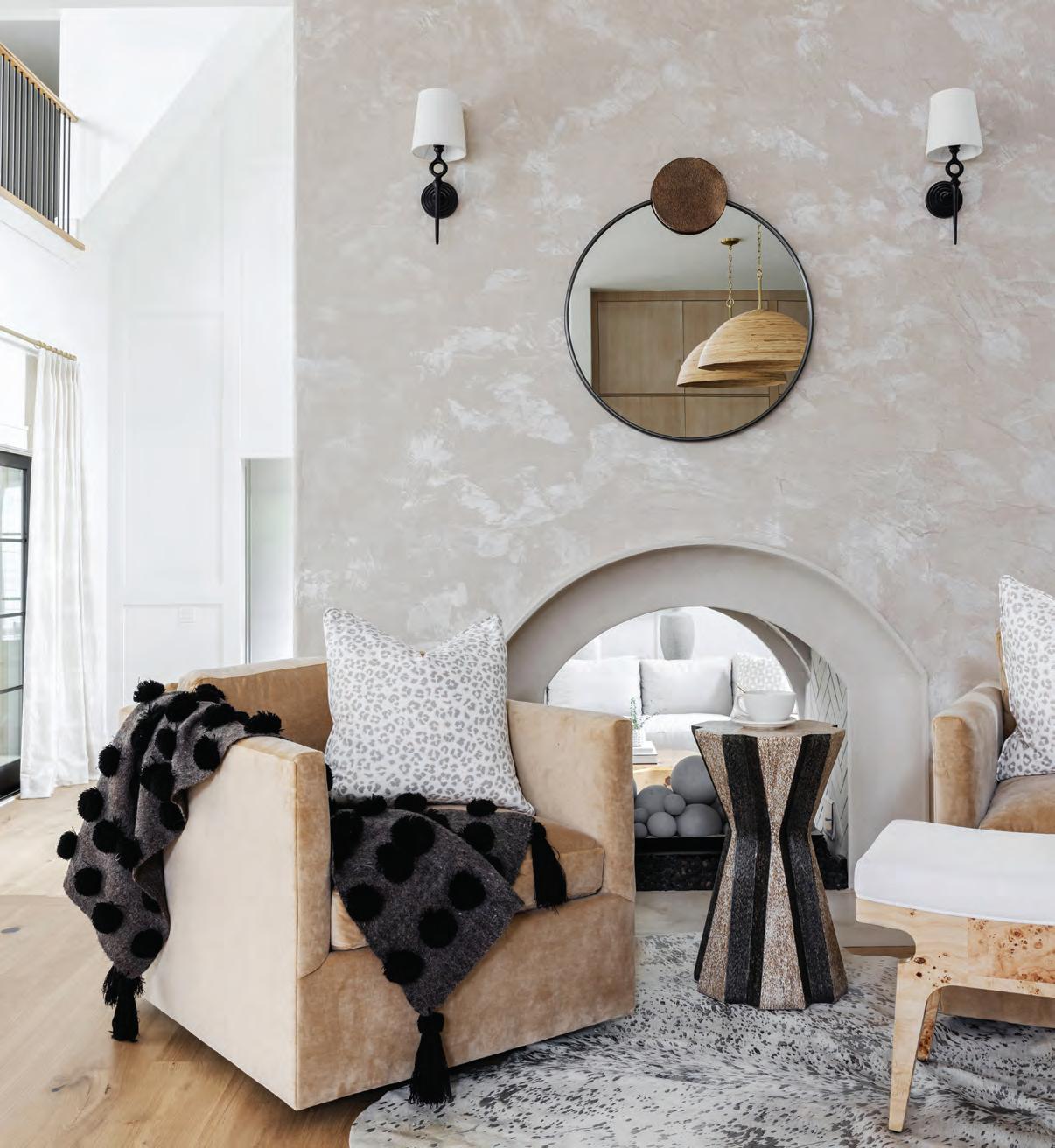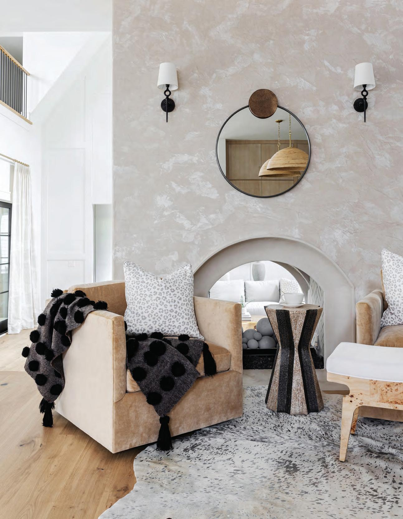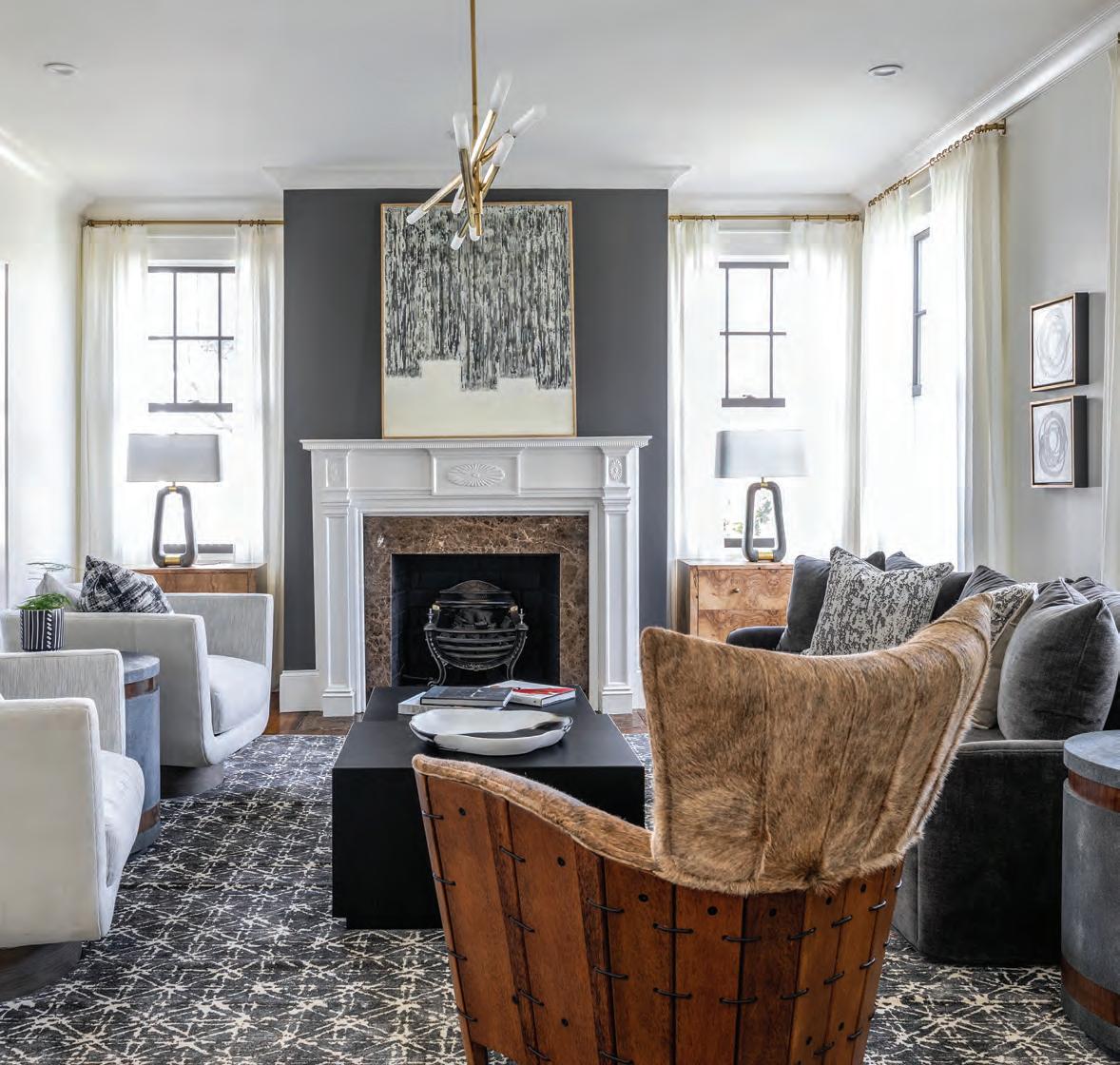 The home was built in the 1920s. I wanted to keep as many of the older architectural details as I could and incorporate modern pieces with a few period selections. We started in the front living room, keeping the original look of the fireplace but filling the room with more contemporary yet comfortable pieces for this family of six. Shades of grays and whites, along with a bit of black, always anchor a room and make a great palette. Texture was key, so we incorporated a combination of burl, hide, shagreen, stone, and black metal. We kept the hand-painted walls, which I love. The Stark rug, featuring
