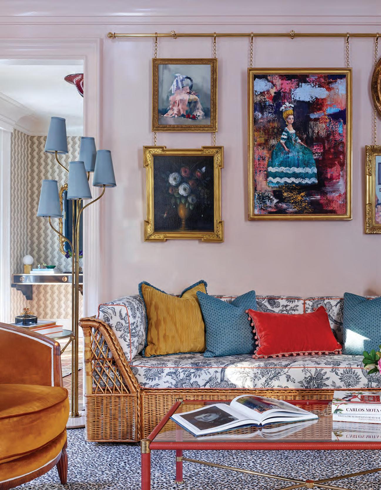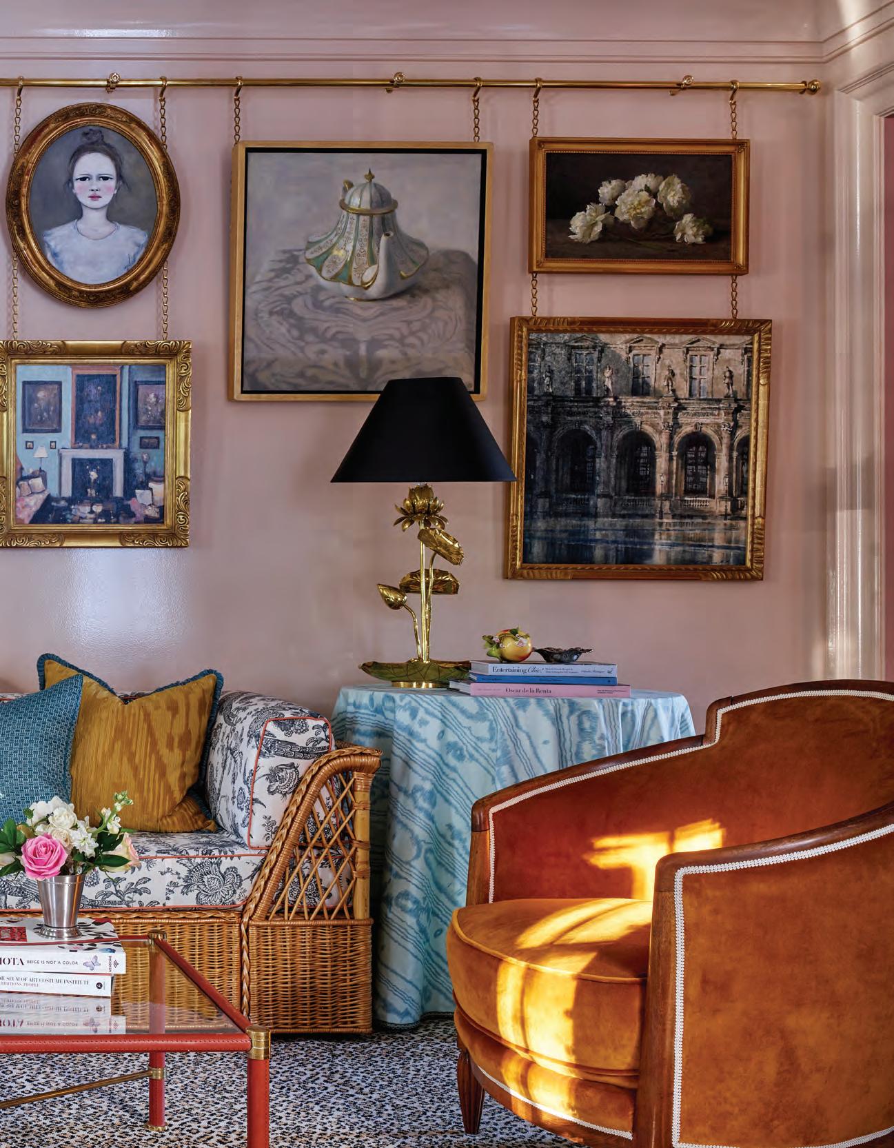 Designer Charlotte Lucas pulled together this pretty and feminine living room as a gathering spot for a family of five in their forever home. The goal was to make it feel full of life and layers, and this room, just off the entry, is filled with the homeowners’ favorite art. Marble drink table: Mambo Unlimited. Custom sectional: Lester Furniture in Pierre Frey fabric. Drapes: Brunschwig & Fils.