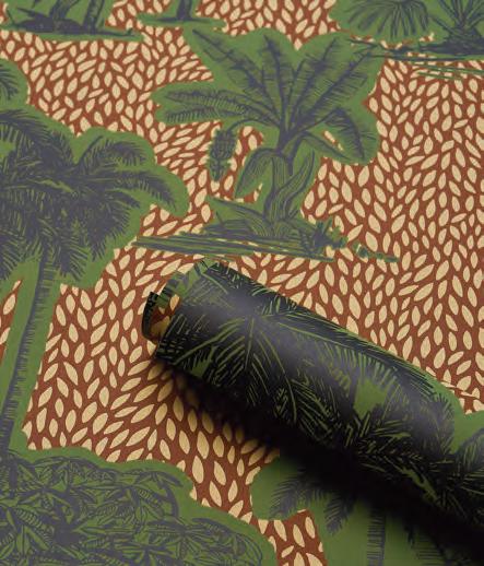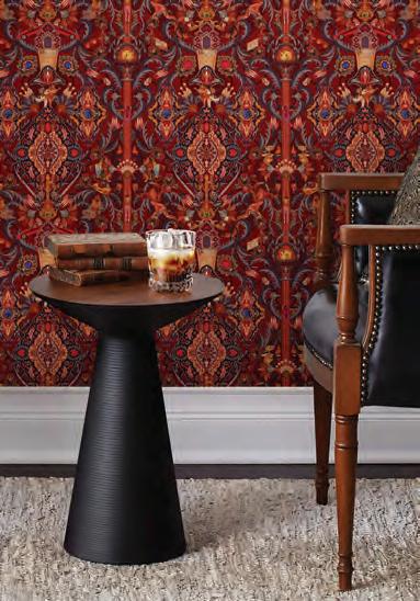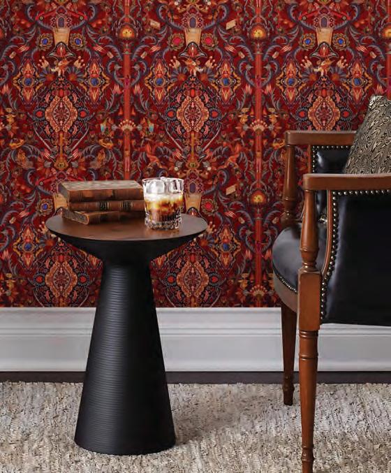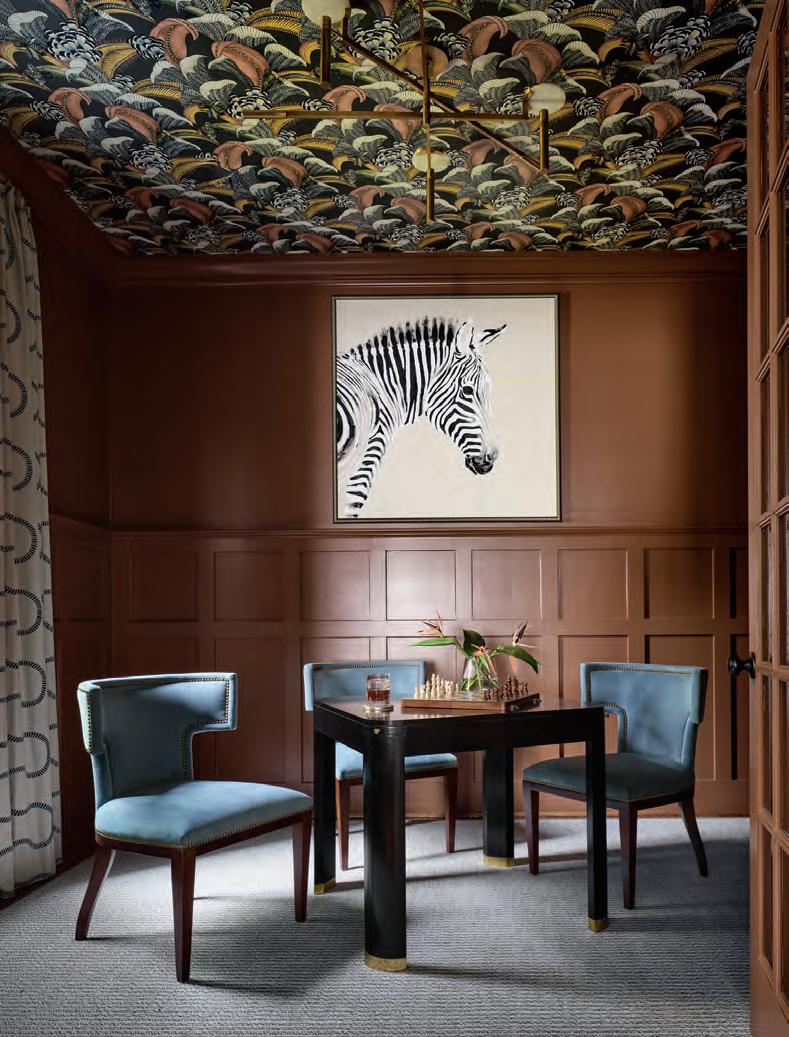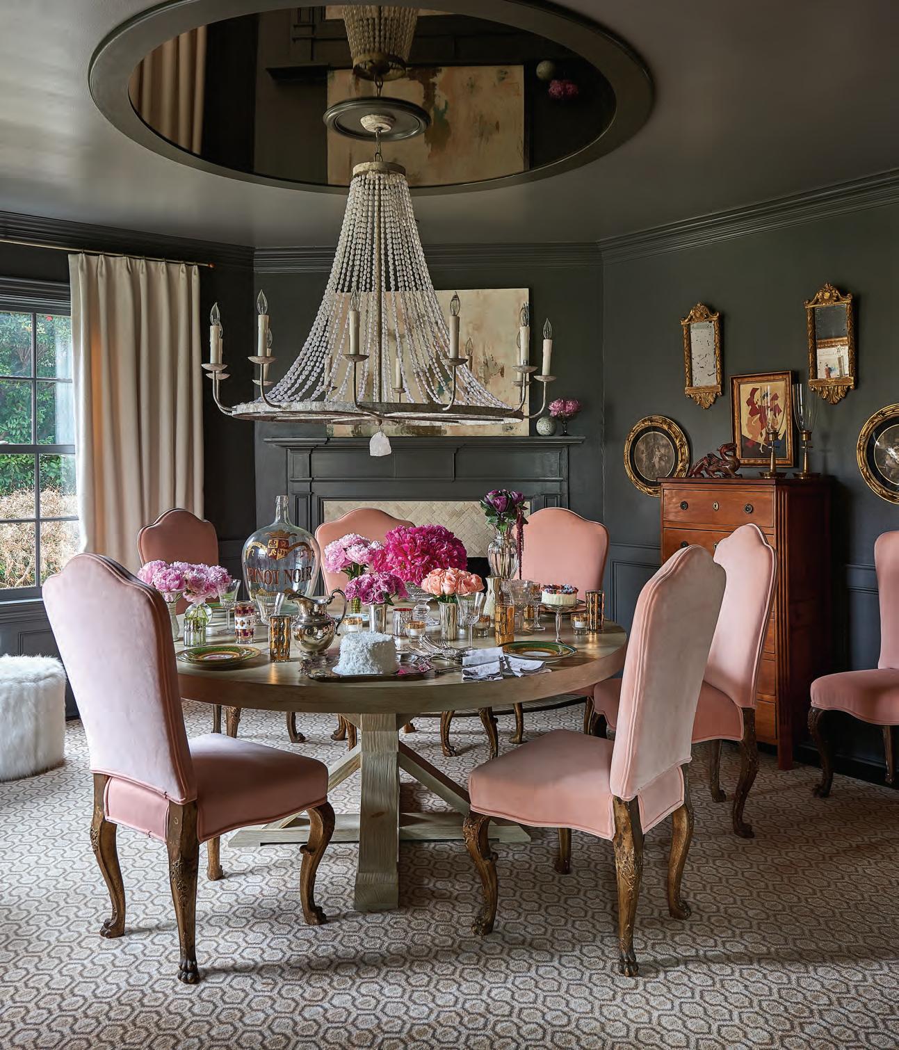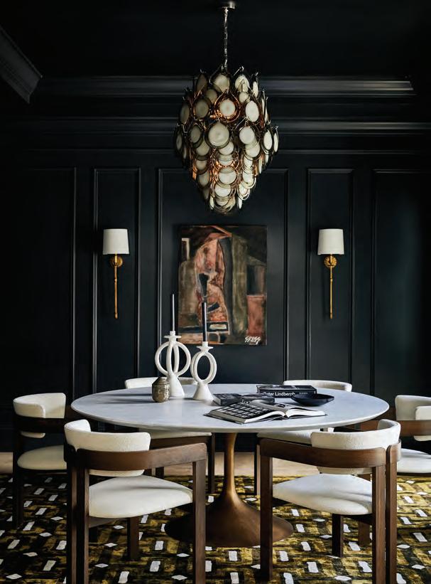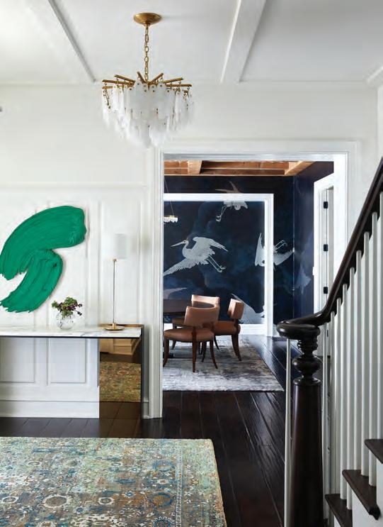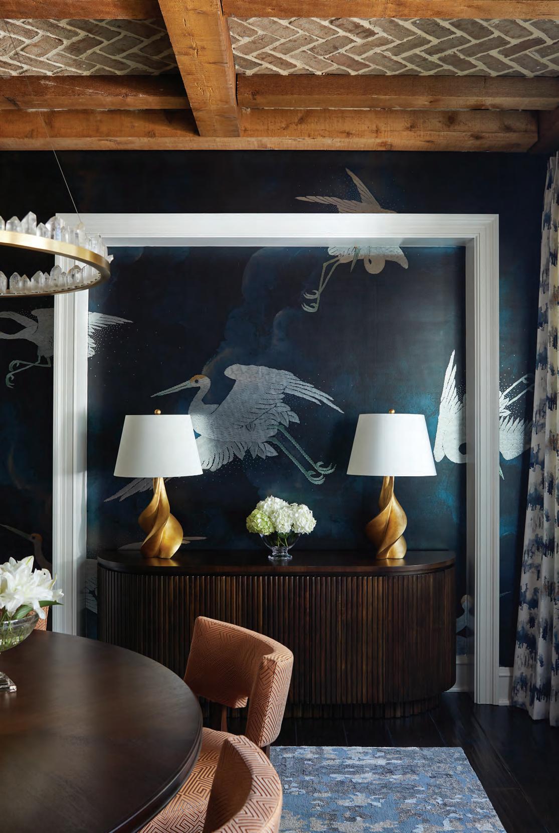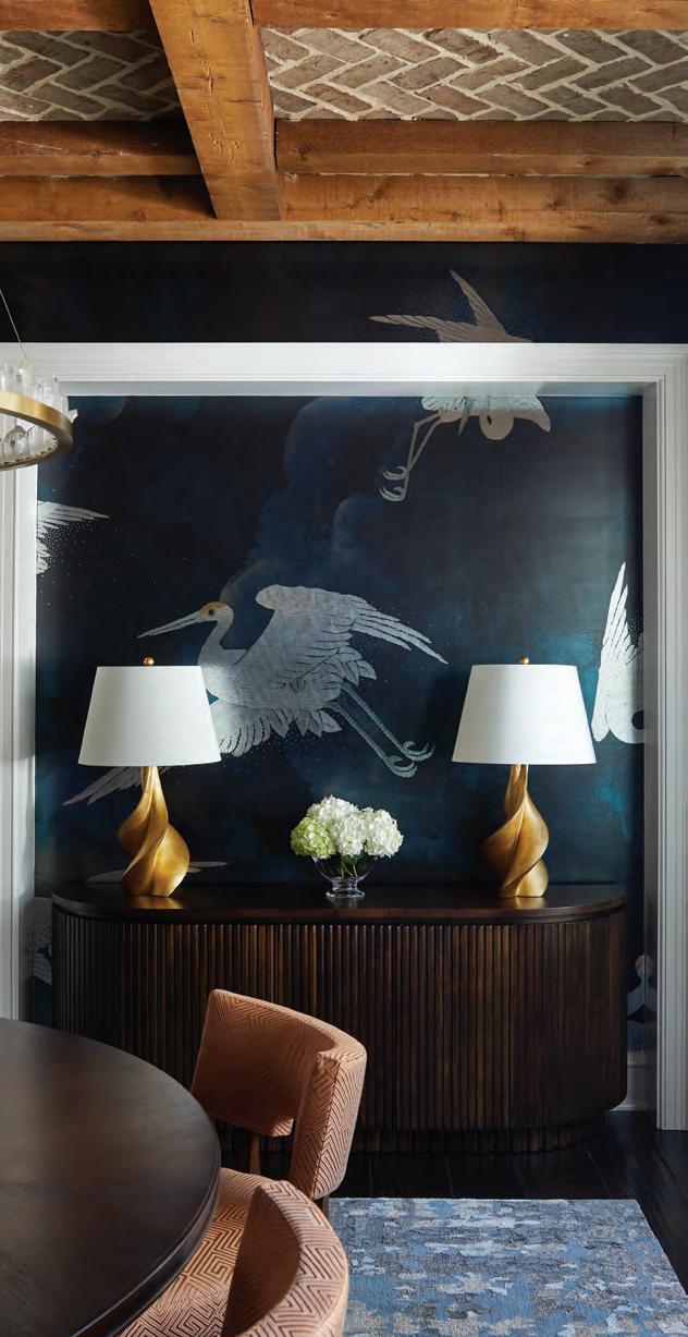 The mural wallpaper in this dining room designed by Amy Vermillion encapsulates the beauty and uniqueness of her client (pg 66).