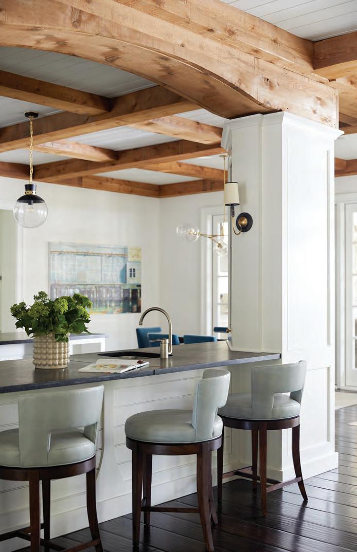 ABOVE: Vermillion chose these stools because of the curvature of the backs, which mimic the same lines as the pieces in the nearby dining room. Stools: Hickory Chair. Sconce: Visual Comfort. OPPOSITE: