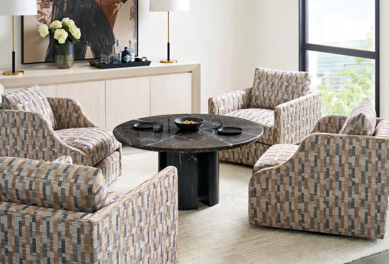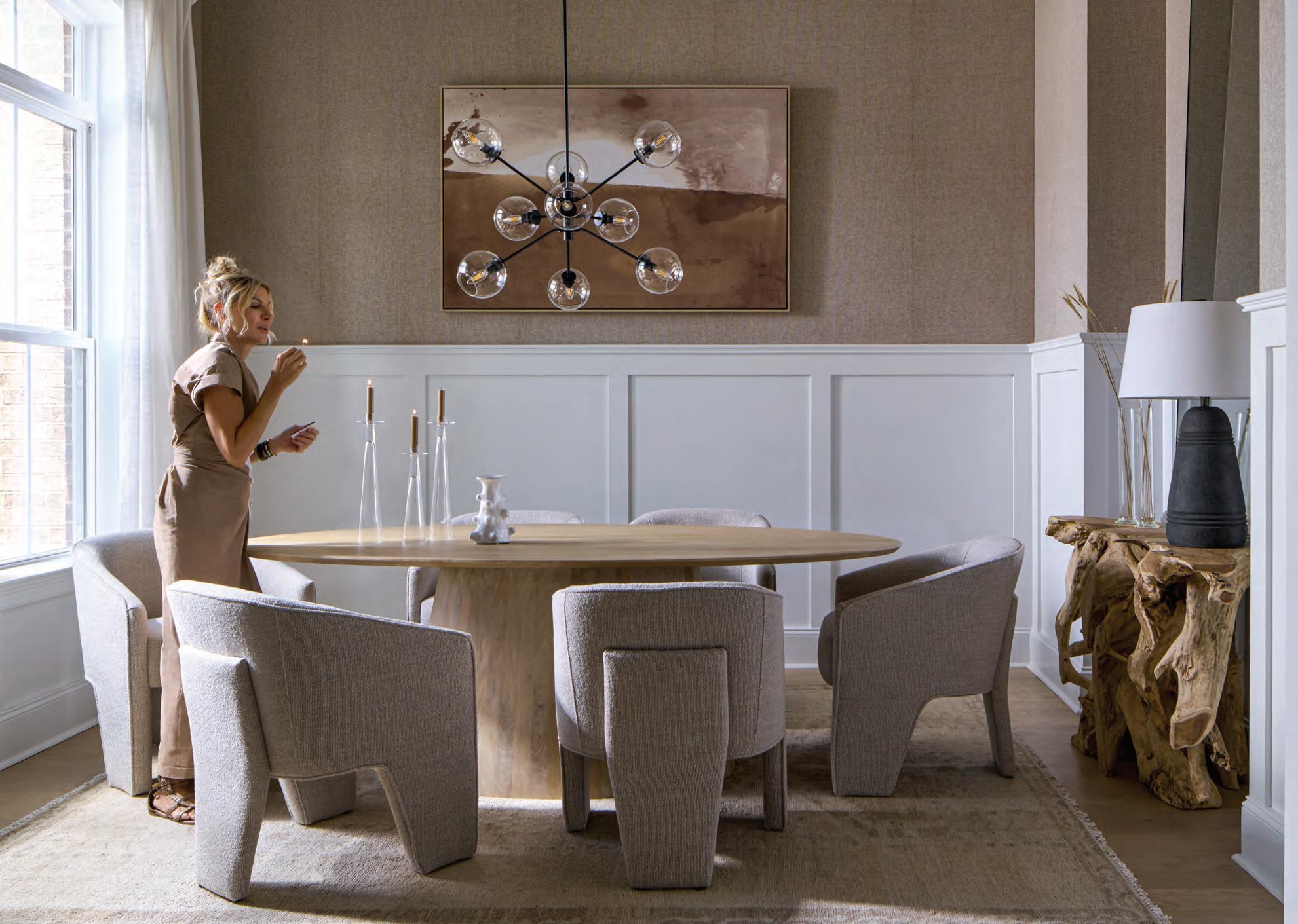 Beginning in the dining room, Vermillion suggested a statement-making mural wallpaper, which doubles as artwork, to complement the ceiling details. “I really wanted some movement on the walls,” she explains of the Phillip Jeffries choice. “This room didn’t need much. We knew we wanted to keep the lines very simple, but Staci wanted something unique, too.” To create additional but subtle interest in the dining room, Vermillion added pieces that boast their own architectural details, like a curved-front buffet with fluted detailing. A pair of lamps mirror the movement in the wallcovering.