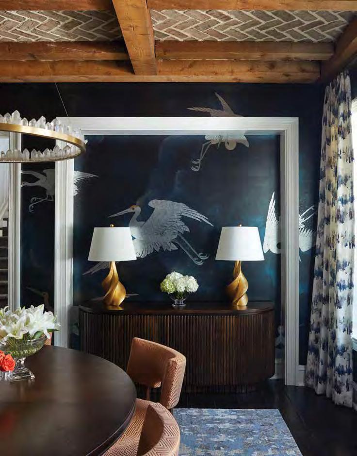 The dining room’s mural wallpaper was chosen to complement the existing architectural details in the room, such as the brick ceiling. Wallpaper: Phillip Jeffries. Buffet: Hickory Chair.