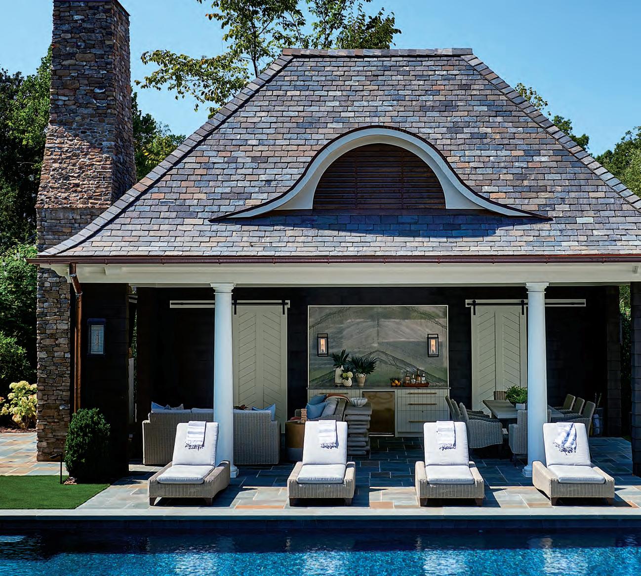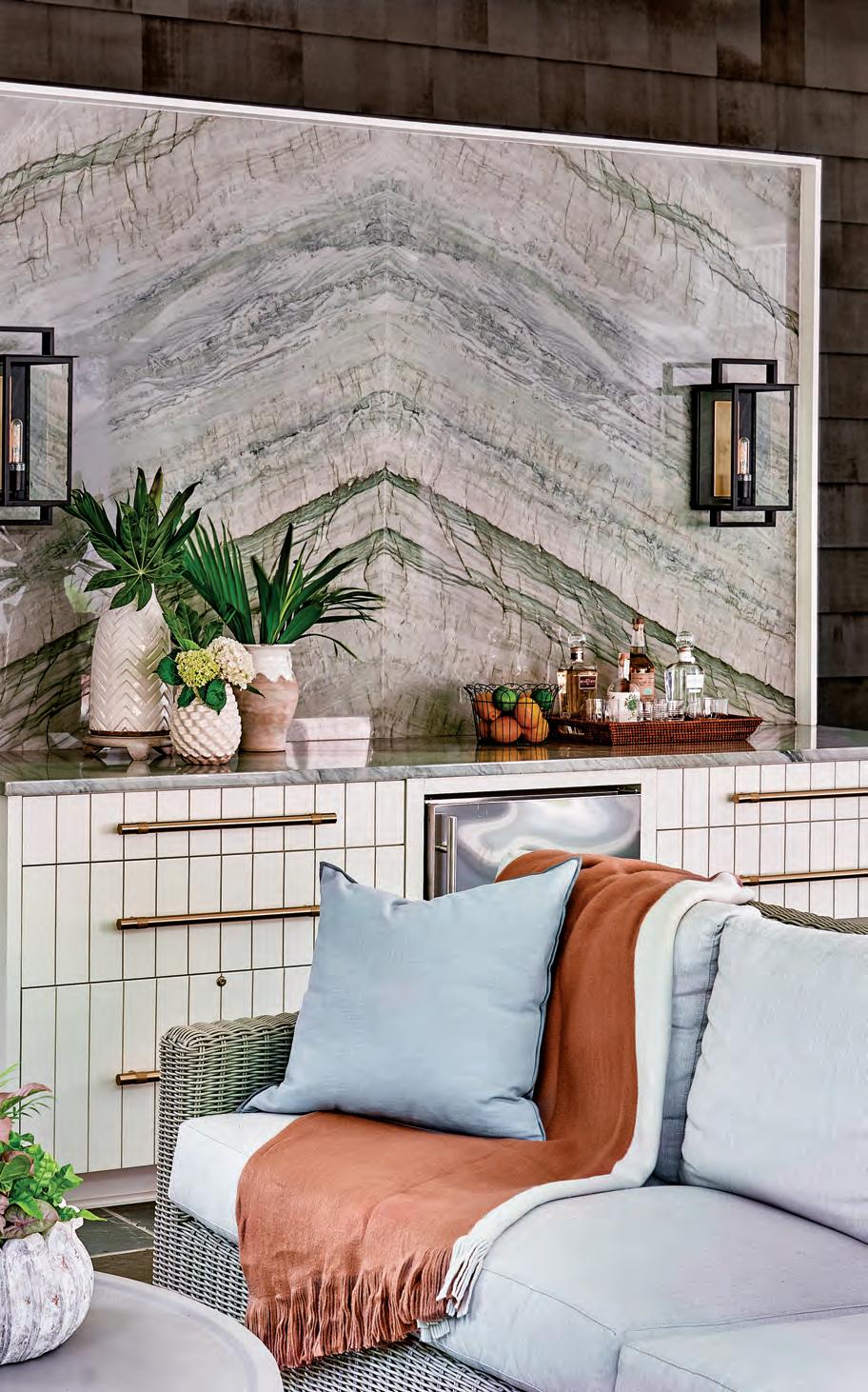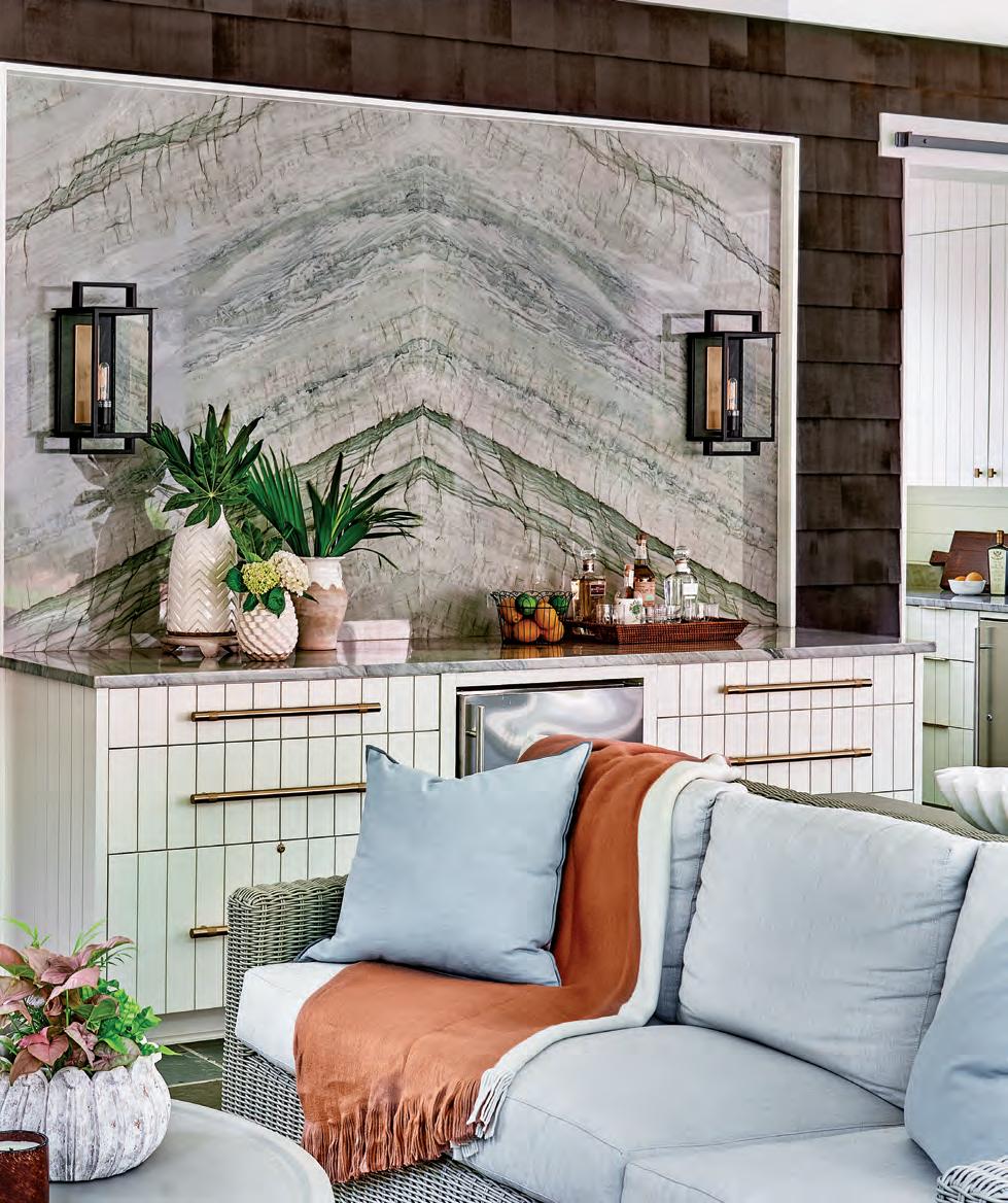 The rest of the home is an homage to color and pattern in small—and big—doses, including the pool-house addition, for which Greeson also drew the plans. In the bar and serving area, a pair of book-matched quartzite slabs double as artwork and a backsplash. “It’s an earthy quartzite that’s so beautiful,” says Vermillion of the choice. “The cedar shingle was vertical, so the quartzite keeps your eye moving to the left and the right. It just flows.”
