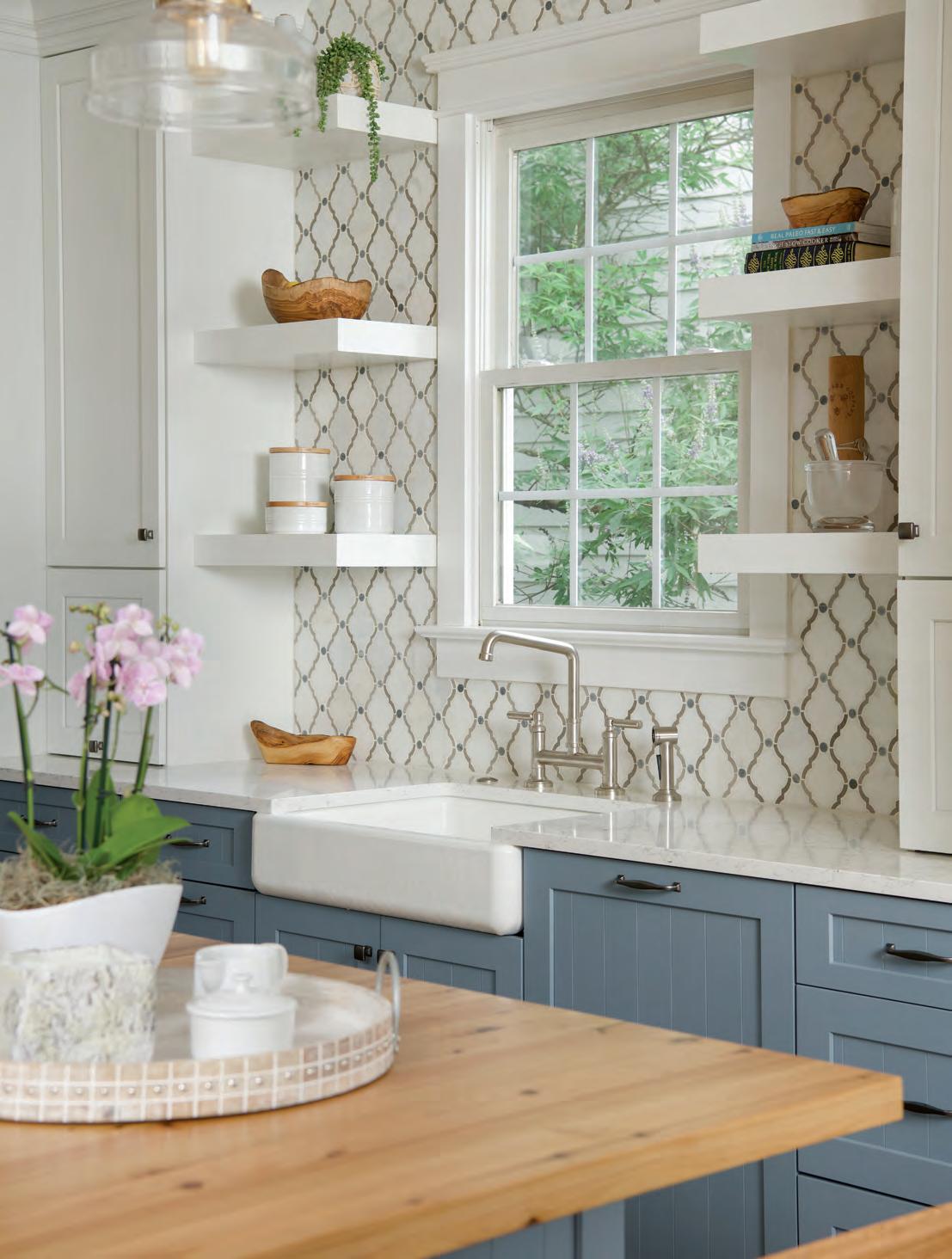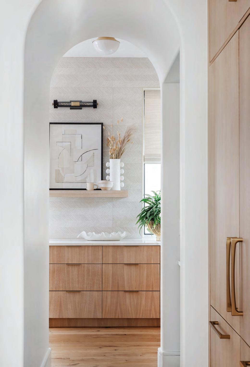 WHEN OUR CLIENT first stepped foot in this house, the outdated and dark interiors seemed too daunting to tackle; however, they loved the location and the space it provided for their family’s immediate and future needs. They bravely took the leap, with Clark & Clark at their side, and trusted our vision of a whole-home makeover. In the kitchen, we needed to lift everything up. Beautiful beams and floor-to-ceiling windows brought in wonderful light, but the materials weighed it down. By shifting to a palette of taupes, weathered wood, and soft grays paired with warm whites, we were able to create balance. We painted the beams a light taupe and the cabinetry a warm gray with tan undertones, and pulled in a white quartz with tan and gray veining alongside a marble geometric backsplash that married every element. Finally, we enclosed the pass-through area on the right to add more cabinets for storage and increase functionality.