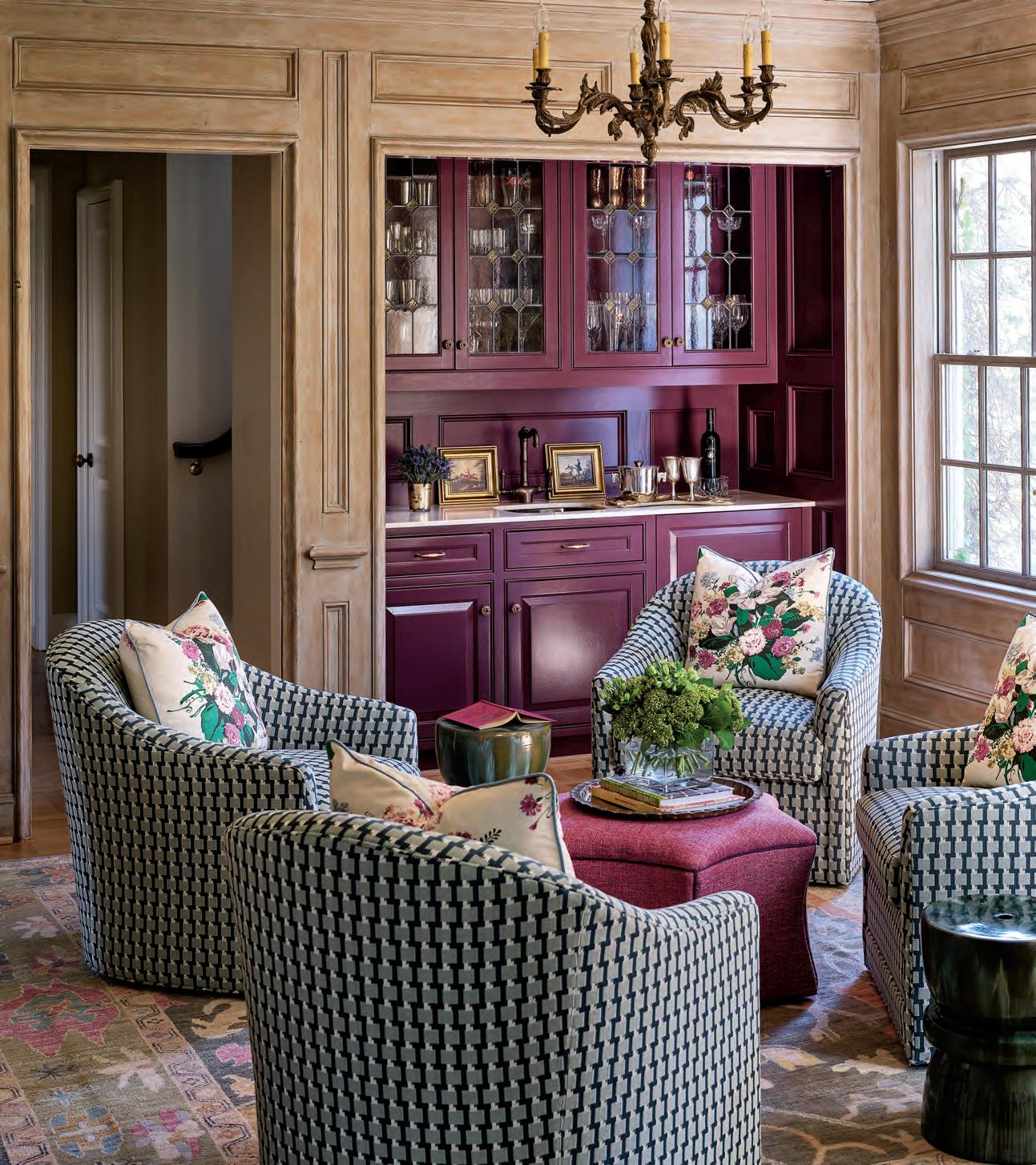 An amethyst jewel-box bar is tucked into the corner of the ceruse-paneled den designed by Sarah Fisher, serving as a cozy perch for cocktails before or after dinner. With three young boys, the adults needed their own space to gather, and this moody room creates atmosphere. Chair fabric: Rebecca Atwood. Ottoman: Charles Stewart.