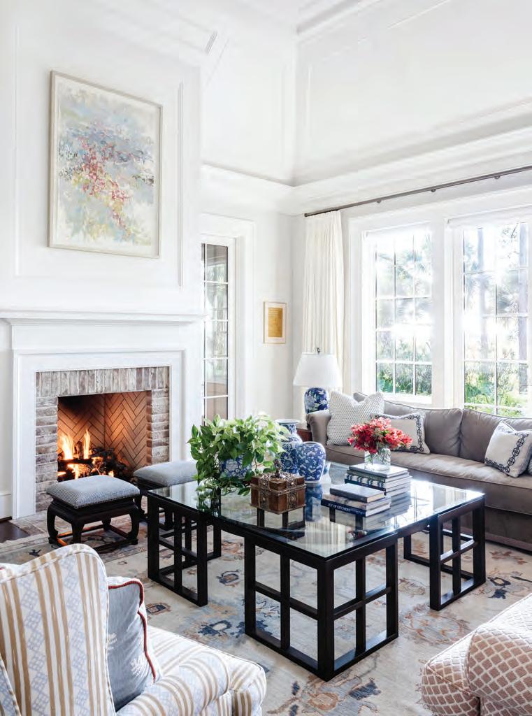 This keeping room just off the kitchen was designed by Maggie Cathey of Perch Interiors and invites the family to gather at all hours—from mealtimes to post dinner, from casual and quiet mornings to game nights with family. It’s comfortable, cozy, and always ready. Chandelier: Currey & Company. Roman shades: Erica M. Powell Textiles. Chairs: Four Hands.
