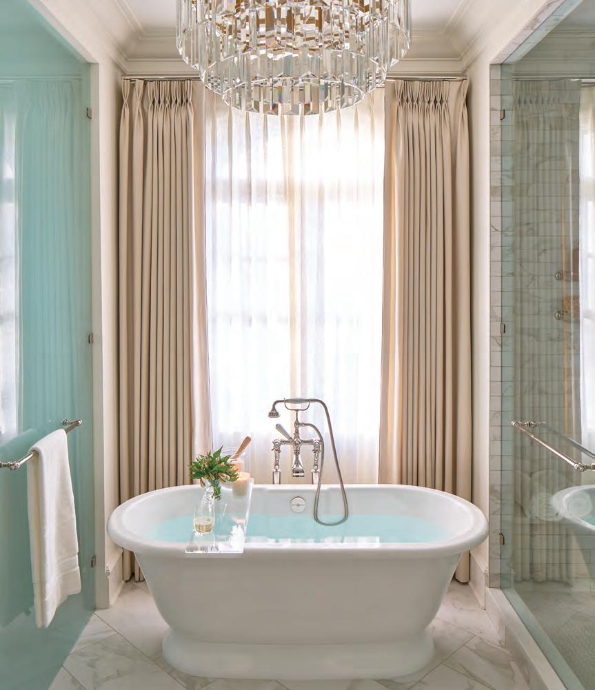 EMILY HODGE INTERIOR DESIGN worked with Kathy Ector Homes and DCI Cabinets to transform this Foxcroft owner’s bathroom from a dreary space into an elegant, lightfilled, cozy retreat. EHD used in-house 3D modeling to help the clients truly visualize the new space, from aesthetic to scale. While building the 3D model, EHD located two opportunities for hidden storage, making the room as functional as it is beautiful. They selected exquisite performance tile from Walker Zanger, lighting from Visual Comfort, and the most luxurious motorized drapery by C&K Design. Calming colors, soft lighting, and natural materials create a space that is now a true escape.