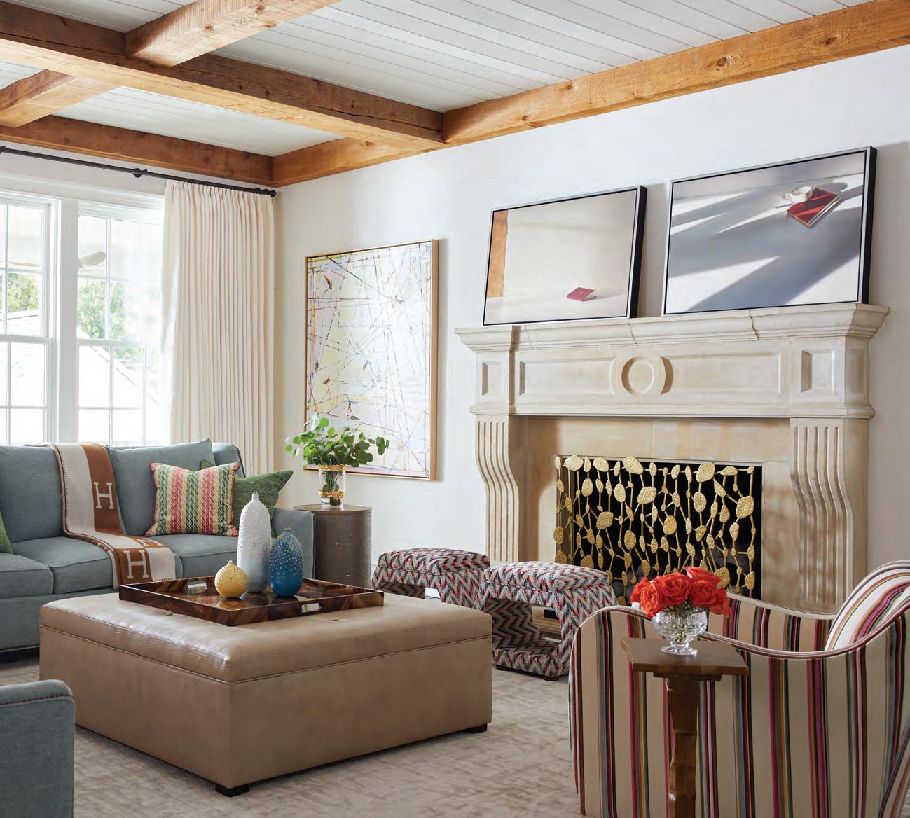The playful artwork in the stairway draws the eye through the kitchen. Artwork: Kelly Reemsten. OPPOSITE: Vermillion updated most of the soft goods in the family room and kept the original wood beams and fireplace. The goal was to highlight the existing artwork above the mantle, which she did with the addition of the sofa and pillow fabrics. Chairs: Hickory Chair. Chair fabric: Romo.