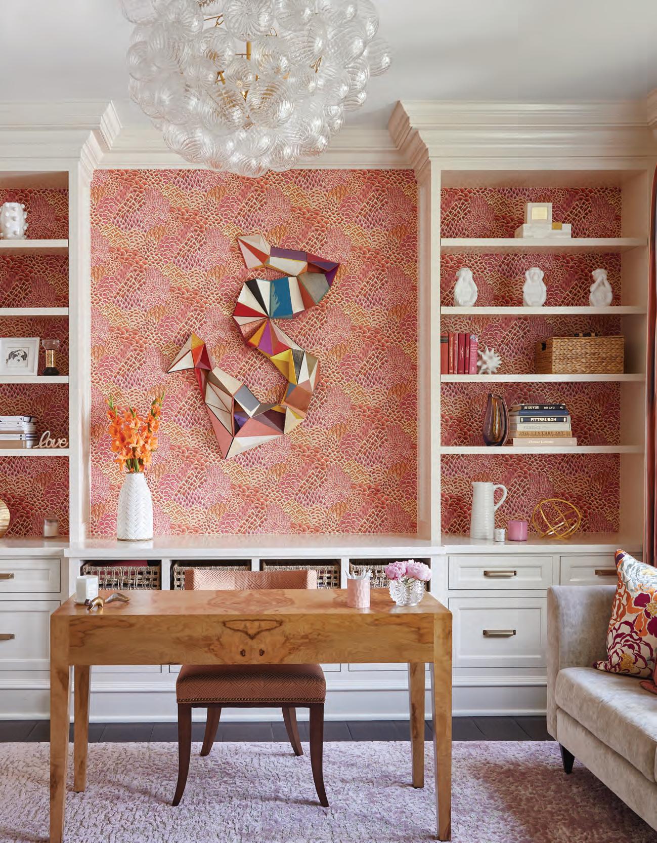 Across the foyer, Vermillion made another bold move by installing wallpaper by Kravet to the backs of the existing built-ins, which were formerly a khaki green and refinished and repainted a fresh white. “Staci’s home office did not match her either,” says Vermillion. “That’s why we turned to oranges and pinks and pattern.” The chef’s kiss to the space was the commissioned sculptural piece by Conny Goelz Schmitt, which sits behind the desk. “I wanted something that complemented the wallpaper Amy chose, something with movement and color,” says Mills, who, along with her husband, has collected various pieces over the years.