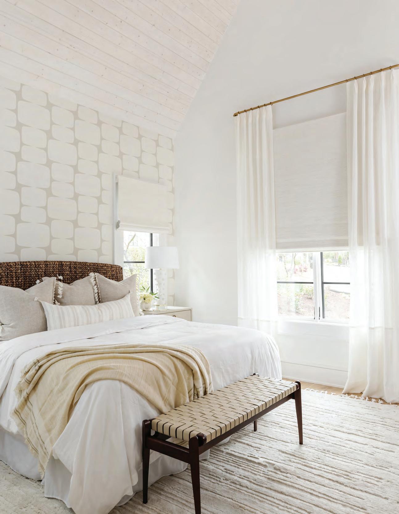 The primary bedroom employs a soft and subtle palette, accented with darker green tones pulled in from a separate comfortable seating area. The nursery’s subtly patterned wallpaper, unique light fixtures, and soft draperies bring sophistication and fresh design to a tranquil space for their new baby girl. A comfortable, relaxing secondary owner’s suite was on the must-have list for the family to accommodate overnight guests.
